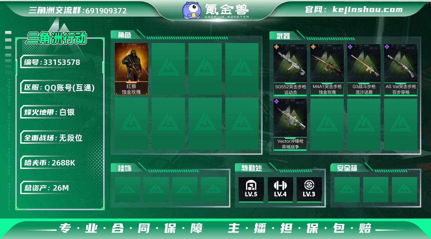26m总资产-2688k哈伏币-27烽火等级-白银-2战场等级-无军衔 【干员外观】:红狼-蚀金玫瑰 【近战皮肤】:近战-黑鹰 【传说外观】:M4A1突击步枪-蚀金玫瑰,SG552突击步枪-运动员 【史诗外观】:G3战斗步枪-流沙送葬,AS Val突击步枪-百步穿杨,Vector冲锋枪-异域战争 【稀有外观】:腾龙突击步枪-冰天雪地,K437突击步枪-生存指令,MK47突击步枪-精英联盟,UZI冲锋枪-亚特兰蒂斯,勇士冲锋枪-主宰,勇士冲锋枪-冰天雪地 【普通外观】:M4A1突击步枪-粉色涂装,QBZ95-1突击步枪-高雅黑,K416突击步枪-几何迷彩,SCAR-H战斗步枪-数码迷彩,CAR-15突击步枪-变色龙,SR-3M紧凑突击步枪-变色龙,QCQ171冲锋枪-三角洲力量,M1014霰弹枪-高雅黑,QJB201轻机枪-磐石,SKS射手步枪-三角洲力量,R93狙击步枪-变色龙 【军牌】:军牌-神秘艺术,军牌-信誉优秀,军牌-小心鳄鱼 【挂饰】:挂饰-蚀金玫瑰,挂饰-崩岩重炮*2,挂饰-暗行哨兵*3