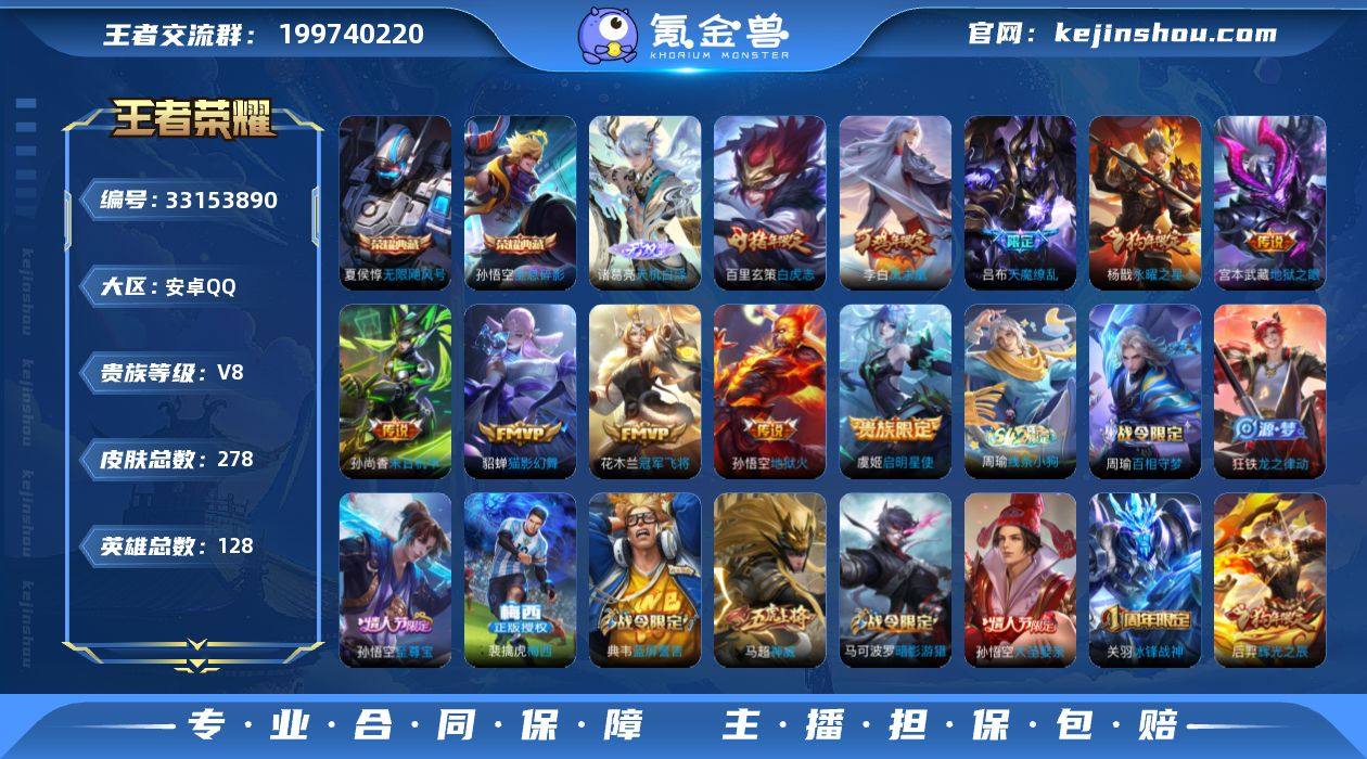 编号A00754 不可二次 V8 278皮肤 2典藏 1无双 10传说 天机白泽 无限飓风号 全息碎影 梅西 天魔缭乱 至尊宝 白虎志 凤求凰 神威 永曜之星 前尘 启明星使 吕布-末日机甲 画中游 冰锋战神 大圣娶亲 天狼征服者 孙尚香-末日机甲 辉光之辰 猫影幻舞 地狱之眼 冠军飞将 地狱火 幽灵船长 修罗 径山谋武
