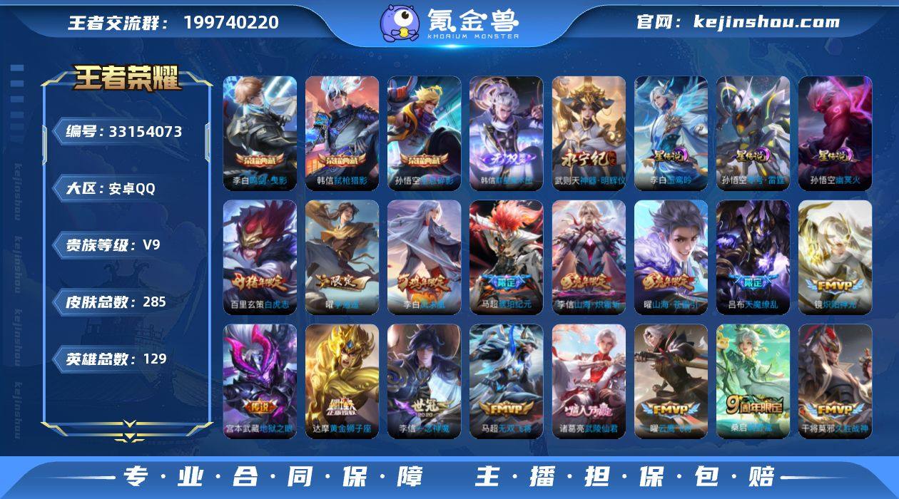 安卓Q-V9-永恒钻石I段位-129英雄-284皮肤-3典藏皮肤-2无双-24传说-82史诗 【英雄全皮】:孙权全皮,橘右京全皮,敖隐全皮,戈娅全皮,影全皮 【荣耀典藏】:孙悟空全息碎影,李白鸣剑曳影,韩信弑枪猎影 【无双皮肤】:韩信群星魔术团,武则天神器明辉仪 【传说皮肤】:桑启鸣野蒿,马超琥珀纪元,孙悟空齐天大圣,曜山海苍雷引,李信山海炽霜斩,李白诗剑行,橘右京枫霜尽,马超无双飞将,曜李逍遥 ,镜炽阳神光,虞姬启明星使,孙悟空零号赤焰,曜云鹰飞将,李信一念神魔,貂蝉猫影幻舞,干将莫邪久胜战神,达摩黄金狮子座,百里玄策白虎志,后羿黄金射手座,诸葛亮武陵仙君,李白凤求凰,宫本武藏地狱之眼,孙悟空地狱火,吕布天魔缭乱 【限定皮肤】:姜子牙天穹之誓,杨戬破阵退雄兵,李白谪仙醉月,狄仁杰阴阳师,赵云皇家上将,赵云引擎之心,赵云百木心枪,鲁班七号狮舞东方,钟无艳超时空战士,孙膑天狼运算者,白起夜都怪侠,芈月幻夜卜梦,吕布天魔缭乱,元歌云间偶戏,元歌无心,夏侯惇匿光决锋者,甄姬落雪兰心,马可波罗暗影游猎,马可波罗山海玄木吟,狄仁杰魔术师,达摩沙漠行僧,项羽海滩派对,韩信逐梦之影,韩信飞衡,韩信傲雪梅枪,王昭君午后时光,兰陵王...