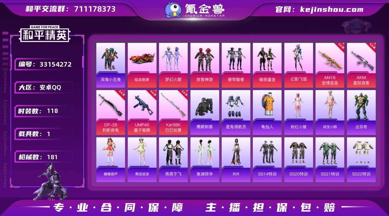 安卓 手Q-5粉装-8特效枪-1载具-3粉色飞行器-53604热力值-7王牌印记-118套装-181枪皮 【热门品类】:粉装-梦幻火箭,套装-深海小丑鱼,套装-龟仙人,套装-粉红小猪 【粉色套装】:粉装-梦幻火箭,粉装-放客神游,粉装-碧穹智者,粉装-暗夜鎏金,粉装-幻影飞狐 【粉色枪皮等级】:AKM-星际浪客(六级),M416-至情至圣(九级),ACE32-萌骑漫游(一级),UMP45-量子极限(五级),AKS-74U-森灵之息(五级),Kar98K-巳巳如意(四级),Mk14-福马献瑞(四级),DP-28-豹影疾电(五级) 【粉色载具】:焰龙咆哮 【粉色枪皮】:AKM-星际浪客,M416-至情至圣,ACE32-萌骑漫游,UMP45-量子极限,AKS-74U-森灵之息,Kar98K-巳巳如意,Mk14-福马献瑞,DP-28-豹影疾电 【粉色飞行器】:炫彩糖果飞行器,梦幻火箭飞行器,歌者泠鸢飞行器 【粉色降落伞】:极限特训降落伞,梦幻火箭降落伞,垂柳戏鸭降落伞,音爆索尼克降落伞,金蛇镇世降落伞,鬼刀降落伞,绯穹魔姬降落伞,炫彩糖果降落伞 【稀有套装】:套装-龟仙人,套装-绒宝小鹅,套装-马上有钱,套装-迅捷龙虾,角色-达芬奇,套装-糖糖葫芦,套装-青团波波,套装-燕燕于飞,套装-鱼渊荷华,角色-风玲,套装-雨过天青,套装-红釉青花 【稀有枪皮】:AK...