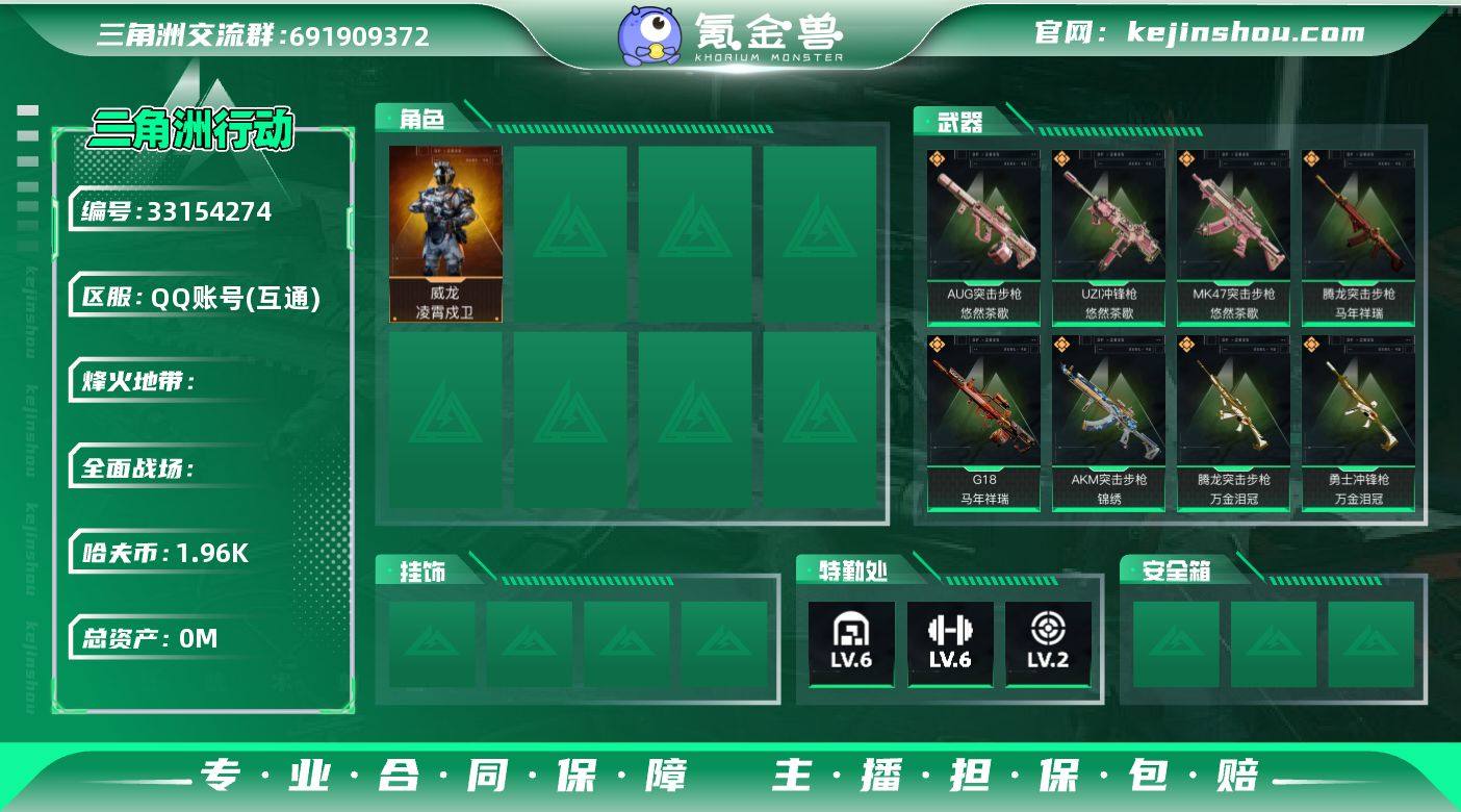 45m总资产-1962k哈夫币-53烽火等级-白银-19战场等级-军士长 【干员外观】:威龙-凌霄戍卫 【近战皮肤】:近战-处刑者1级,近战-黑鹰 【传说外观】:AKM突击步枪-锦绣,QBZ95-1突击步枪-凌霄戍卫,K416突击步枪-行动记录,AUG突击步枪-悠然茶歇,腾龙突击步枪-马年祥瑞,腾龙突击步枪-万金泪冠,MK47突击步枪-悠然茶歇,UZI冲锋枪-悠然茶歇,SR-3M紧凑突击步枪-荼蘼,勇士冲锋枪-万金泪冠,AWM狙击步枪-万金泪冠,G18-马年祥瑞 【史诗外观】:SMG-45冲锋枪-阿萨拉特攻,MP7冲锋枪-六套之力,PKM通用机枪-阿萨拉特攻 【稀有外观】:K416突击步枪-酷炫狂拽, AK-12突击步枪-马年新春,CAR-15突击步枪-前沿科技,MP5冲锋枪-弄臣,SMG-45冲锋枪-行动开启,SMG-45冲锋枪-幻影结构,M249轻机枪-毛鲁斯之力,QJB201轻机枪-哈夫克卫队,Mini-14射手步枪-荣耀列队,SKS射手步枪-弄臣,QSZ92G-一帆风顺 【普通外观】:M4A1突击步枪-高雅黑,QBZ95-1突击步枪-高雅黑,QBZ95-1突击步枪-海浪,QBZ95-1突击步枪-海色,腾龙突击步枪-三角洲力量,K416突击步枪-几何迷彩,M16A4突击步枪-高雅黑,M7战斗步枪-红色涂装,M7战斗步枪-黑巧甜心,SG552突击步枪-狂欢,SCAR-H战斗步枪-数码迷彩,G3战...