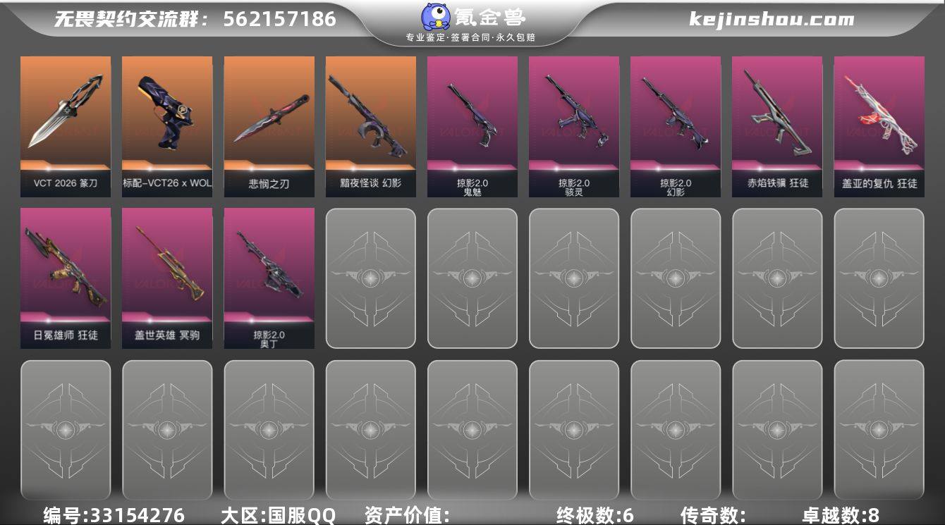 【2.4万库存.26套.掠影2.0套.悲悯之刃.盖亚.日冕雄师.黯夜怪谈.】YXy6610【无二次】[因赛季更新游戏段付以上号为准] 【套装】:VCT 2026 赛季套装,无畏契约季前邀请赛套装,掠影//2.0套装 【英雄】:幻棱,炼狱,维斯,暮蝶,钛狐,壹决,铁臂,捷风,雷兹,幽影,不死鸟,贤者,猎枭,零,芮娜,奇乐,尚勃勒,霓虹,夜露,K/O,海神,盖可,黑梦,钢锁 【近战武器】:近战武器-VCT 2026 篆刀,近战武器-无畏契约季前邀请赛 悲悯之刃,近战武器-影钩 【狂徒】:狂徒-盖亚的复仇,狂徒-日冕雄师,狂徒-赤焰铁骥 【幻影】:幻影-黯夜怪谈,幻影-掠影//2.0 【冥驹】:冥驹-盖世英雄 【奥丁】:奥丁-掠影//2.0 【骇灵】:骇灵-掠影//2.0 【VCT手枪】:标配-VCT26 x WOL 【鬼魅】:鬼魅-掠影//2.0,鬼魅-诡秘蛇影 【卡面】:精灵大战 卡面,欢迎来到底城 卡面,南瓜盛典 卡面,最高舞台 卡面,梦幻奶茶 卡面,失控边缘 卡面,无畏契约GO!第一卷:芮娜 卡面,无畏契约GO!第一卷:零 卡面,无垠星环 卡面,《双城之战》金克丝 卡面,代号红色 卡面,新兵报到 卡面,V契约 卡面,无畏契约 卡面 【喷漆】:嗨宝南瓜灯 喷漆,控场勿近 喷漆,超级粉丝 喷漆,捷风差距 喷漆,审判之爪...
