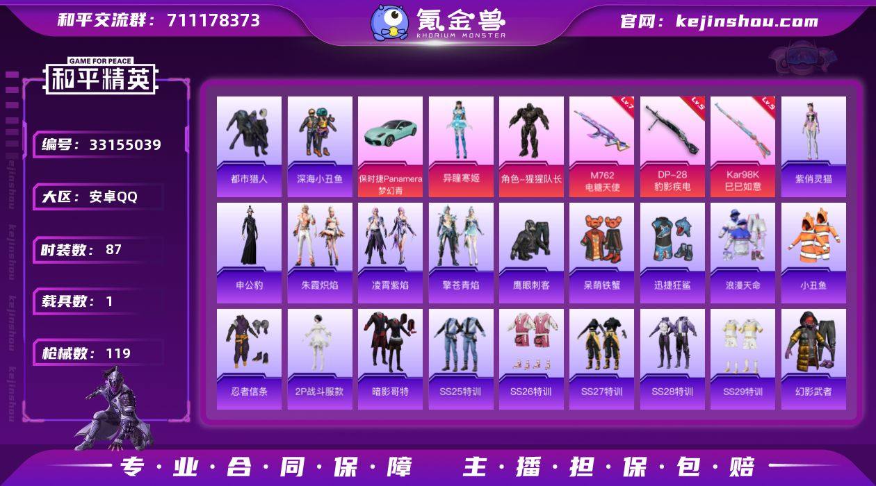 安卓【小号 套装-浪漫天命,套装-都市猎人,角色-2P战斗服款,套装-暗影哥特,M762-电糖天使(七级),Kar98K-巳巳如意(五级),保时捷Panamera(梦幻青)】 手Q-2粉装-4特效枪-1载具-2粉色飞行器-34592热力值-3王牌印记-87套装-119枪皮 【热门品类】:套装-浪漫天命,套装-都市猎人,套装-深海小丑鱼,套装-小丑鱼,套装-忍者信条,角色-2P战斗服款,套装-暗影哥特 【粉色套装】:角色-猩猩队长,角色-异瞳寒姬 【粉色枪皮等级】:M762-电糖天使(七级),Kar98K-巳巳如意(五级),Mk14-福马献瑞(四级),DP-28-豹影疾电(五级) 【粉色载具】:保时捷Panamera(梦幻青) 【粉色枪皮】:M762-电糖天使,Kar98K-巳巳如意,Mk14-福马献瑞,DP-28-豹影疾电 【粉色飞行器】:炫彩糖果飞行器,萌物绒绒飞行器 【粉色降落伞】:幻影战神降落伞,春暖花开降落伞,未来歌姬降落伞,萌物绒绒降落伞,初号机 觉醒Ver.降落伞,幻彩电音降落伞,炫彩糖果降落伞 【稀有套装】:套装-炫彩糖果,套装-迅捷龙虾,套装-朱霞炽焰,套装-凌霄紫焰,套装-擎苍青焰,角色-申公豹,角色-紫俏灵猫,套装-雨过天青,套装-红釉青花 【稀有枪皮】:AKM-环太平洋,AKM-缤纷海域,AKM-龙的传人,SCAR-L-夜灯,SCAR-...