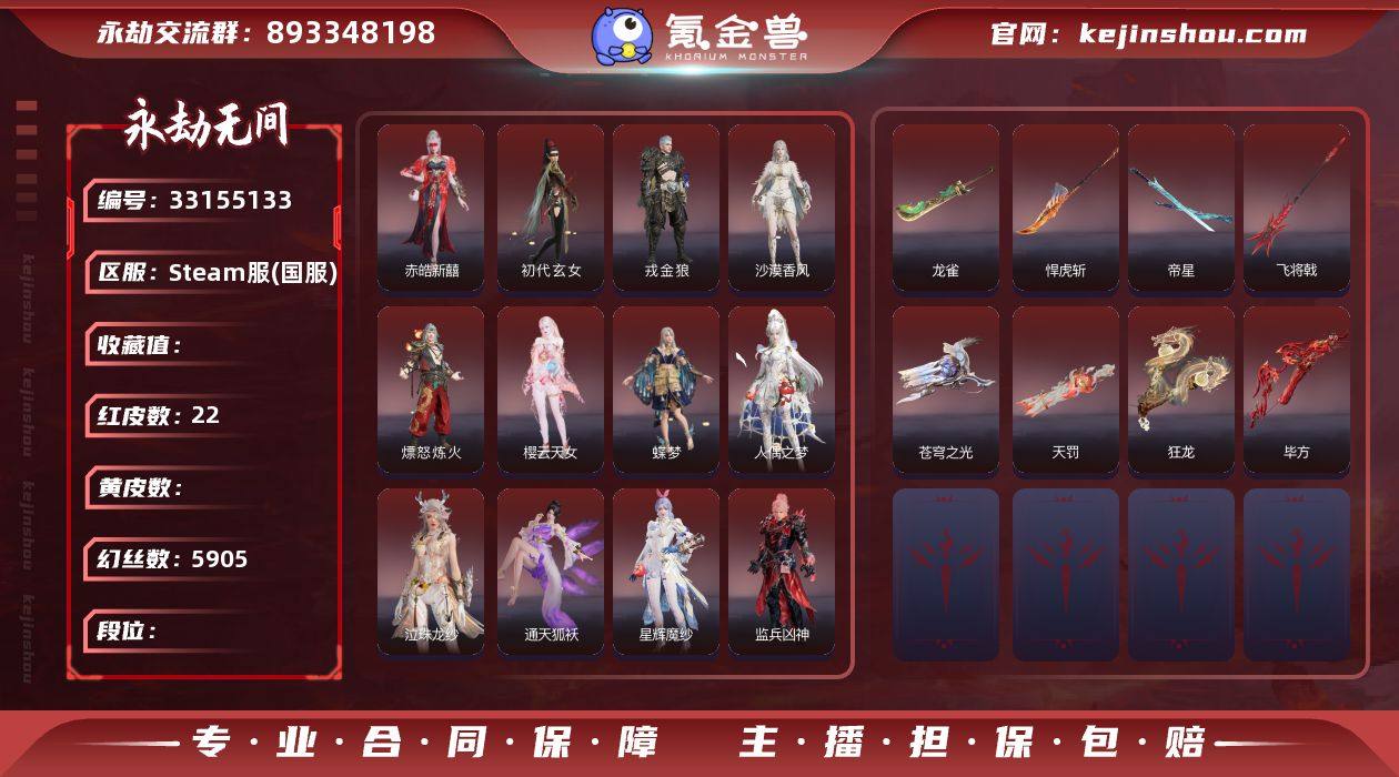 WJ5882,steam端游,可换绑,三人段位铂金1,霜烬十殿门五百强,声望17,22红,608金,等级388,收藏值389960,幻丝5905,金砖2,通行证Lv1,变身器,百战枷锁,绿野守护竹韵悠,2674初代机,黑猫警长警长现身,珥冰,御祥云,炎烈珠,璃光洛天依共鸣,洛天依共鸣,铠甲勇士帝皇腰带,荆魂,红色神品,沙漠香风,监兵凶神,通天狐袄,星辉魔纱,流金晓锦,守墨麒,戎金狼,赤皓新囍,初代玄女,熛怒炼火,樱云天女,蝶梦,人偶之梦,泣珠龙纱,天罚,苍穹之光,毕方,帝星,龙雀,悍虎斩,飞将戟,狂龙,角色金色皮肤,黄庭道,封神录申公豹,一品仙君,若谷,禄运玉霄,封神录龙吉公主,畲族凤凰装,夏日派对仲夏霜华,赤丹朱湛,枫狩,麟鹿大铠,倒反阴阳凛冬,巅峰极速蕾雅,千秋匠心玉叶景,浣烟纱,福瑞天泽,葫芦兄弟蛤蟆头领,西行劫悟空,冬无归,炽火照夜,干将莫邪,共赴无间幽夜玲珑,春不敛,赤阳天狐,墨行衣,梨园传奇丽娘,封神录妲己,日影花阴,秋藏桂,P5R奥村春NOIR,云溪仙子,绿野守护悠竹萌客,夏日派对初夏绯莓,倒反阴阳铁面,开辟鸿蒙金戈止,百战破荆者,龙之影过江龙,