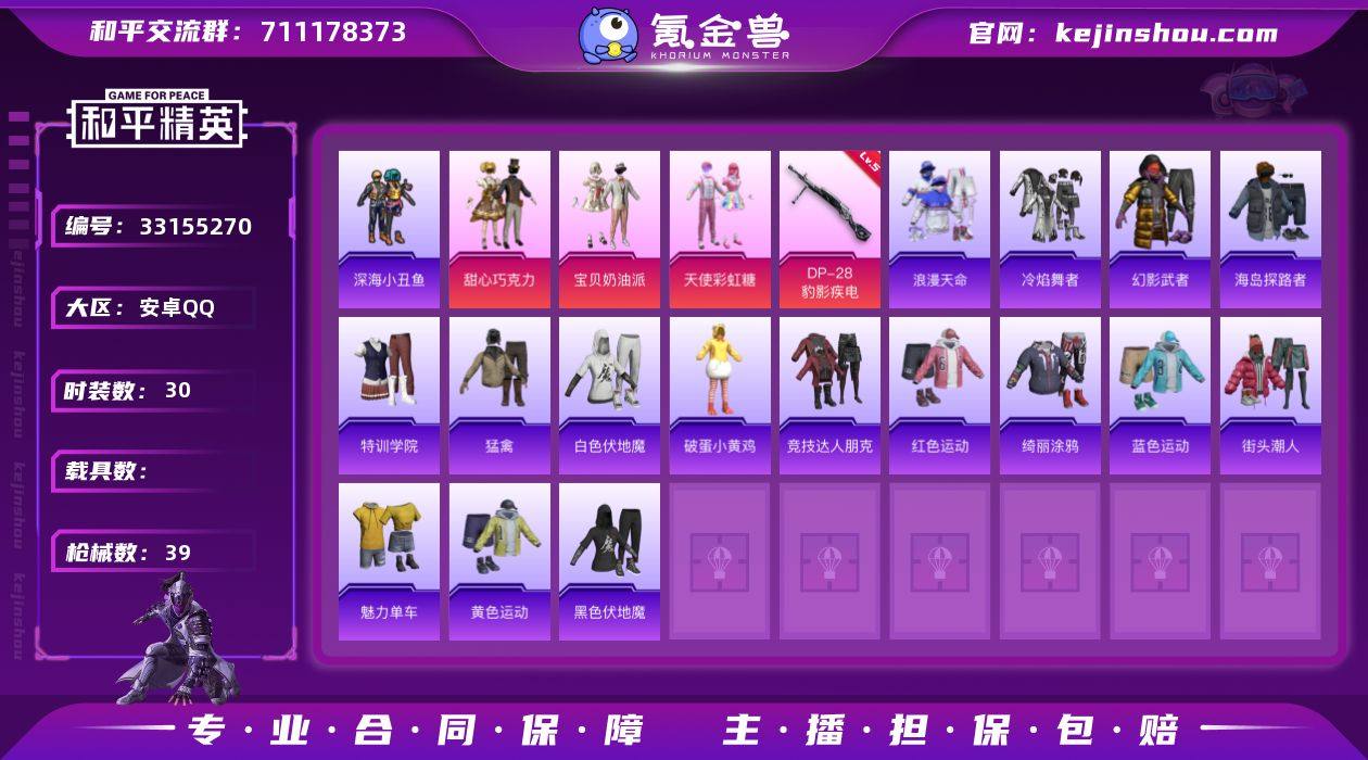 安卓 手Q-3粉装-1特效枪-0载具-1粉色飞行器-10119热力值-2王牌印记-30套装-39枪皮 【热门品类】:套装-浪漫天命,套装-深海小丑鱼 【粉色套装】:粉装-甜心巧克力,粉装-宝贝奶油派,粉装-天使彩虹糖 【粉色枪皮等级】:DP-28-豹影疾电(五级) 【粉色枪皮】:DP-28-豹影疾电 【粉色飞行器】:炫彩糖果飞行器 【粉色降落伞】:甜心宝贝降落伞,春暖花开降落伞,第五大道降落伞,喜羊羊与灰太狼降落伞,极意拳锋降落伞,炫彩糖果降落伞 【稀有套装】:套装-炫彩糖果 【稀有枪皮】:AUG-冰晶雪宝,SCAR-L-夜灯,M416-红色方程式,AUG-耀粉歌者,M762-甜心宝贝,UMP45-夜灯,UMP45-生命誓言,UMP45-极意拳锋,Kar98K-影袭,SKS-迅猛狂鲨,AMR-喜羊羊与灰太狼,M249-破晓战魂,DP-28-甜心宝贝,MG3-幻世战舞者 【其他套装】:套装-冷焰舞者,套装-幻影武者,套装-浪漫天命,套装-海岛探路者,套装-特训学院,套装-猛禽,套装-白色伏地魔,套装-破蛋小黄鸡,套装-竞技达人朋克,套装-红色运动,套装-绮丽涂鸦,套装-蓝色运动,套装-街头潮人,套装-魅力单车,套装-黄色运动,套装-黑色伏地魔,套装-深海小丑鱼 【稀有头盔】:甜心宝贝头盔(3级),甜心宝贝头盔(2级),甜心宝贝头盔(1级...