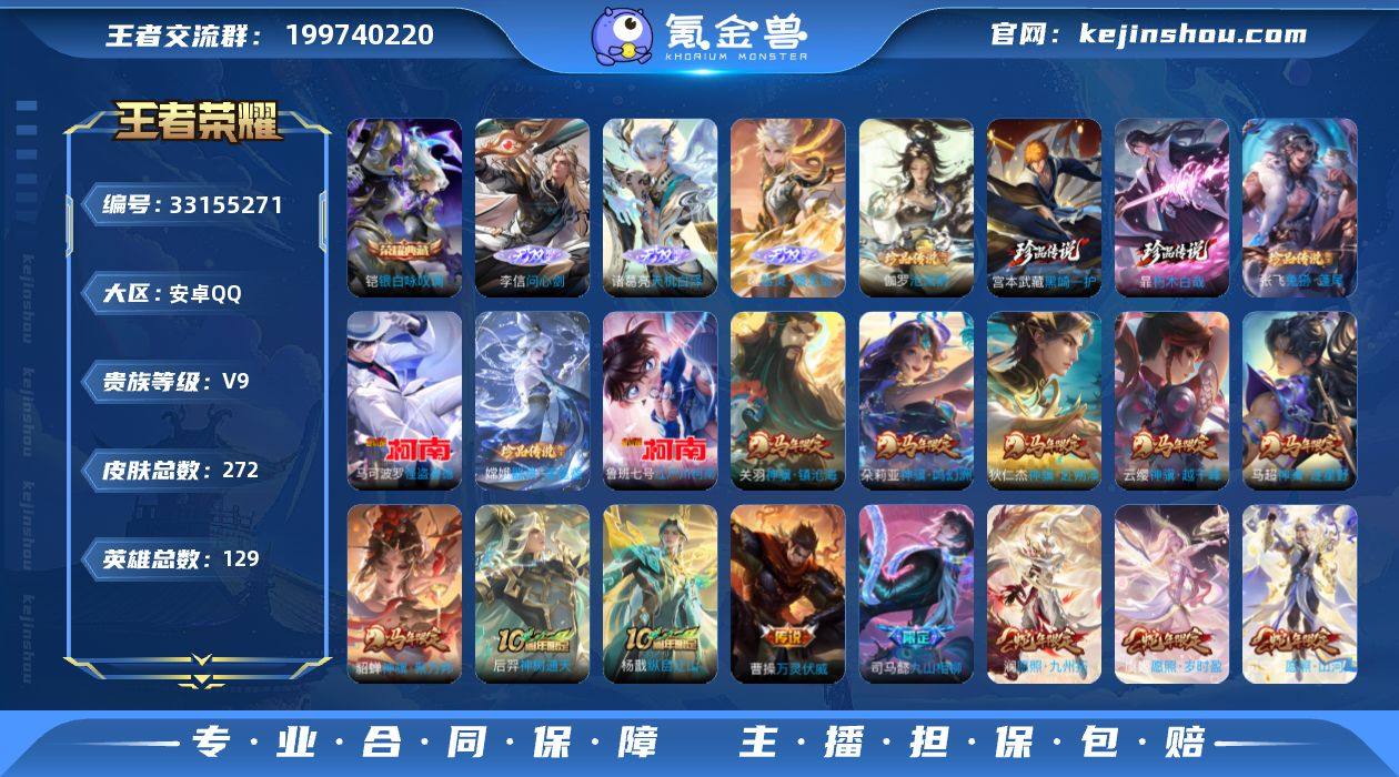 【王者荣耀】珍品无双0 典藏1 无双3 珍品传说7 传说38 史诗76 英雄129 皮肤272 贵族9级 荣耀典藏:银白咏叹调__无双皮肤:器灵·螭龙剑|天机白泽|问心剑__珍品传说:江户川柯南|怪盗基德|器灵·落星盏|兔狲·蓬尾|朽木白哉|黑崎一护|沧流箭__传说皮肤:鸣野蒿|启示之音|孙尚香-异界灵契|启明星使|地狱火|一念神魔|浮生妄|孙尚香-末日机甲|马超-琥珀纪元|怒海麟威|小乔-音你心动|乘龙·淬吴钩|乘龙·铭钟鼎|乘龙·问璇玑|山海·苍雷引|山海·炽霜斩|山海·琳琅生|灼幽烈阳|映山客|幻光神枪|愿照·岁时盈|愿照·山河定|愿照·九州拓|愿照·众生和|愿照·福禄聚|愿照·千秋盛|续相思|九山相柳|万灵伏威|神树通天|纵目迁山|神骥·镇沧海|神骥·鸣幻洲|神骥·赴朔漠|神骥·越千峰|神骥·逐星野|神骥·聚万邦__稀有限定:猪悟能|李小龙|梁祝|山海·碧波行|山海·玄木吟|大漠名商|高山流水|古海寻踪|海滩派对|海盐诗旅|幻夜卜梦|皇家上将|辉光之辰|火炮绅士|剑破天穹|江河有灵|金庭之子|魔术师|匿光侦查者|千军破阵|擒涛扼浪|驱傩正仪|沙漠行僧|探海日志|醍醐杖|天穹祈灯|万华元夜|妄想食味|无心|五谷丰年|星界游侠|演武夺筹|疑决卦|阴阳师|优雅恋人|遇见飞天|御旌|御銮|暗隐猎兽者|暗渊魔法|缤纷独角兽|冰冠公主|...