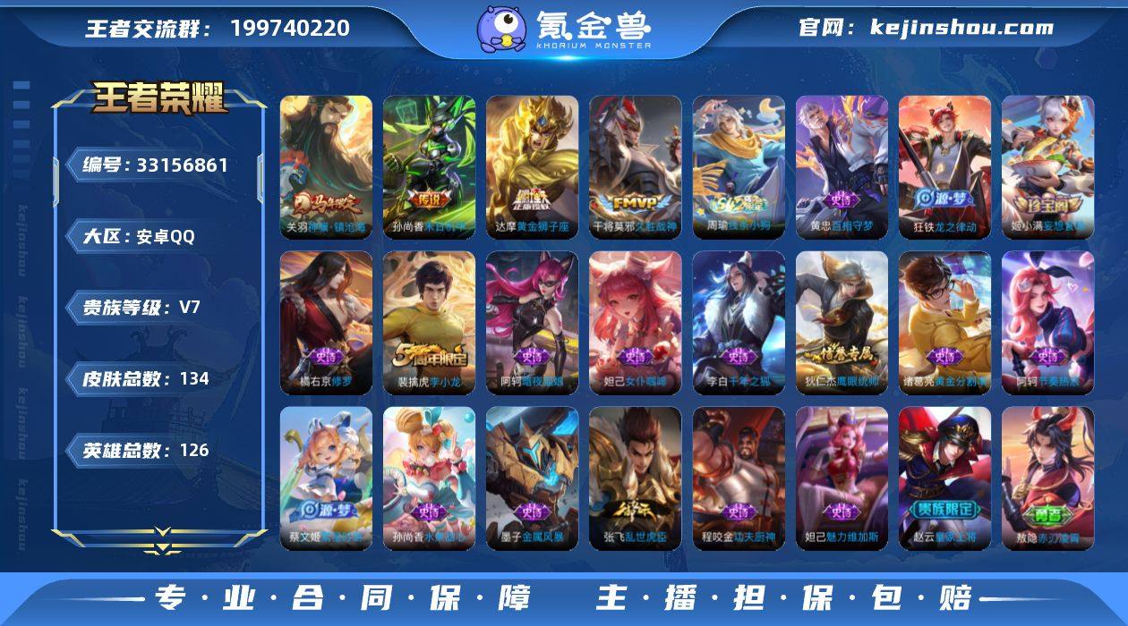 实名: 可修改 性别: 男号 贵族等级: V7 英雄数: 126 皮肤数: 134 传说皮: 黄金狮子座,久胜战神,末日机甲-孙尚香,神骥·镇沧海 限定皮: 李小龙,逐霄战戟 亮点: 【优质装备】:黄金狮子座,久胜战神,末日机甲-孙尚香(绿蚂蚱)