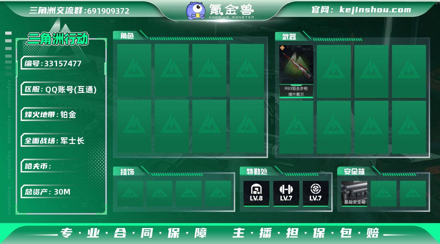 [18423441]总资产:30.5M 2干员外观 3近战传说 21传说枪械 哈夫币:1.716K 不可修改实名 【烽火地带段位】黑鹰 【全面战场段位】军士长 【干员外观】骇爪-维什戴尔,红狼-电锯惊魂 【传说武器皮肤】近战武器-暗星,近战武器-处刑者,近战-信条,SR-25射手步枪-信条,P90冲锋枪-信条,M250通用机枪-骑士之心,R93狙击步枪-维什戴尔,KC17突击步枪-电锯惊魂,47突击步枪-悠然茶歇,M14射手步枪-缄花,AUG突击步枪-悠然茶歇,.357左轮-缄花,UZI冲锋枪-悠然茶歇,SR-25射手步枪-缄花,M14射手步枪-蛮荒,47突击步枪-暗星,SR-3M紧凑突击步枪-暗星,K416突击步枪-行动记录,G18-马年祥瑞,4冲锋枪-夜莺,Mini-14射手步枪-夜莺