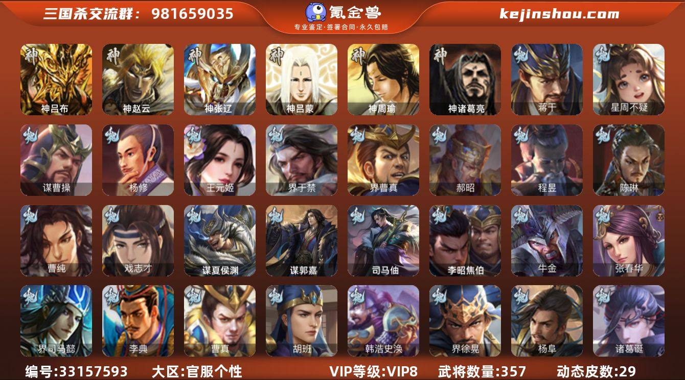 官阶:大将军;VIP等级:VIP8;史诗武将数量:36;动态皮肤数量:29;武将总数:357;史诗宝珠数量:4;将魂数量:5414;神将:4;魏国史诗武将:14;蜀国史诗武将:7;吴国史诗武将:5;群史诗武将:9