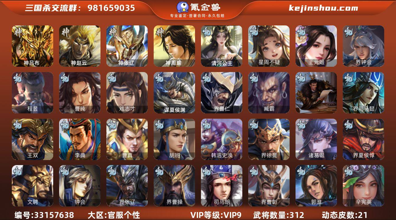官阶:骠骑将军;VIP等级:VIP9;史诗武将数量:29;动态皮肤数量:21;武将总数:312;史诗宝珠数量:35;将魂数量:6584;神将:3;魏国史诗武将:10;蜀国史诗武将:9;吴国史诗武将:1;群史诗武将:10