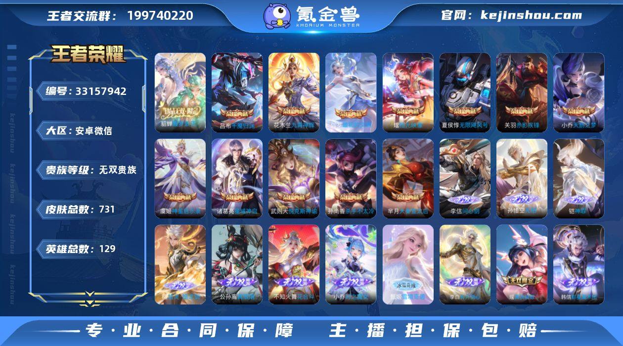 GBZ3970 安卓微信 无双V10 731皮 10w流光积分 13典藏12无双10珍品传说122传说337限定8星元 91按键 5天幕 巅峰1605 中路36段 游走34段 全能高手 金标嫦娥/敖隐/武则天 2421星币 1794英雄碎片 886皮肤碎片 461亲密玫瑰 102蔷薇之心 18改名卡 32印记 7荣耀印记 营地号:237200327【荣耀典藏】九霄神辉,赤影疾锋,星域神启,武则天,倪克斯神谕,天鹅之梦,无限飓风号,杀手不太冷,大秦宣太后,神鉴启示录,拾光映像,最初的交响,千魇归渊, 【星元皮肤】金色仲夏夜,幻海之心,幽冥之眼,未来机甲,时之愿境,时之思念,无限倾慕,游龙堇华, 【热门限定】愿照·众生和,神骥·镇沧海,神骥·鸣幻洲,神骥·赴朔漠,神骥·越千峰,神骥·逐星野,神骥·聚万邦,千劫归真,星君·娄金,愿照·岁时盈,愿照·千秋盛,愿照·山河定,愿照·九州拓,愿照·福禄聚,器灵·浮梦炉,逐花归海,落雪白狼,凤求凰,至尊宝,乘龙·问璇玑,乘龙·淬吴钩,乘龙·铭钟鼎,乘龙·聚宝船,乘龙·忆丹青,白虎志,青龙志,朱雀志,瑞麟志,玄武志,神威,虎魄,李逍遥,冰锋战神,千劫归真,天魔缭乱,白鹤梁神女,夜都魔契,曦玄引女,曦玄引男,琥珀纪元马超,琥珀纪元伽罗,琥珀纪元铠,超元猎域,如梦令男,异界灵契,如梦令女,零号·赤焰,永曜之星,武陵仙君,时雨天司,御风骁将,祈...