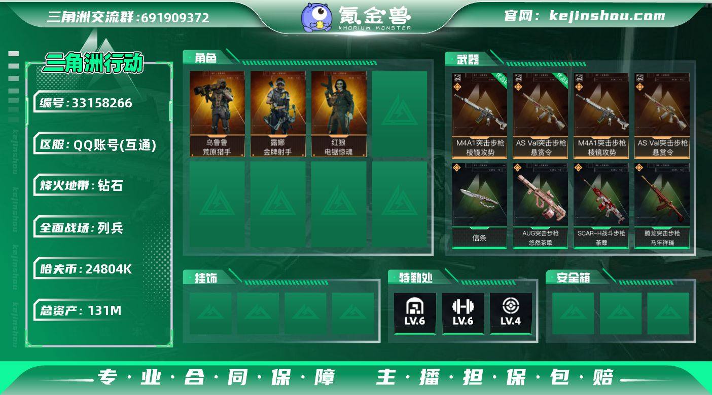 【sjz6438】131m总资产-24804k哈夫币-60烽火等级-钻石-21战场等级-列兵 【干员外观】:红狼-电锯惊魂,露娜-金牌射手,乌鲁鲁-荒原猎手 【近战皮肤】:近战-信条,近战-黑鹰 【典藏外观】:M4A1突击步枪-棱镜攻势,AS Val突击步枪-悬赏令 【典藏外观成色】:M4A1突击步枪-棱镜攻势(优品B),AS Val突击步枪-悬赏令(优品B) 【传说外观】:K416突击步枪-行动记录,AUG突击步枪-悠然茶歇,SG552突击步枪-运动员,SCAR-H战斗步枪-启航,SCAR-H战斗步枪-荼蘼,腾龙突击步枪-马年祥瑞,腾龙突击步枪-万金泪冠,KC17突击步枪-电锯惊魂,MK47突击步枪-悠然茶歇,UZI冲锋枪-悠然茶歇,SR-3M紧凑突击步枪-荼蘼,勇士冲锋枪-万金泪冠,PKM通用机枪-荼蘼,M14射手步枪-蛮荒,M14射手步枪-缄花,SKS射手步枪-骑士,SR-25射手步枪-缄花,AWM狙击步枪-万金泪冠,.357左轮-缄花,G18-马年祥瑞 【史诗外观】:K416突击步枪-冬日风情,K416突击步枪-腊梅,M7战斗步枪-百步穿杨,SG552突击步枪-哈夫克警备,G3战斗步枪-流沙送葬,G3战斗步枪-哈夫克警备,AS Val突击步枪-百步穿杨,K437突击步枪-丛影谍踪,MP5冲锋枪-深海恐惧,MP5冲锋枪-战术竞备,MP5冲锋枪-竞技风,Vector冲锋枪-阿萨拉文明,Ve...