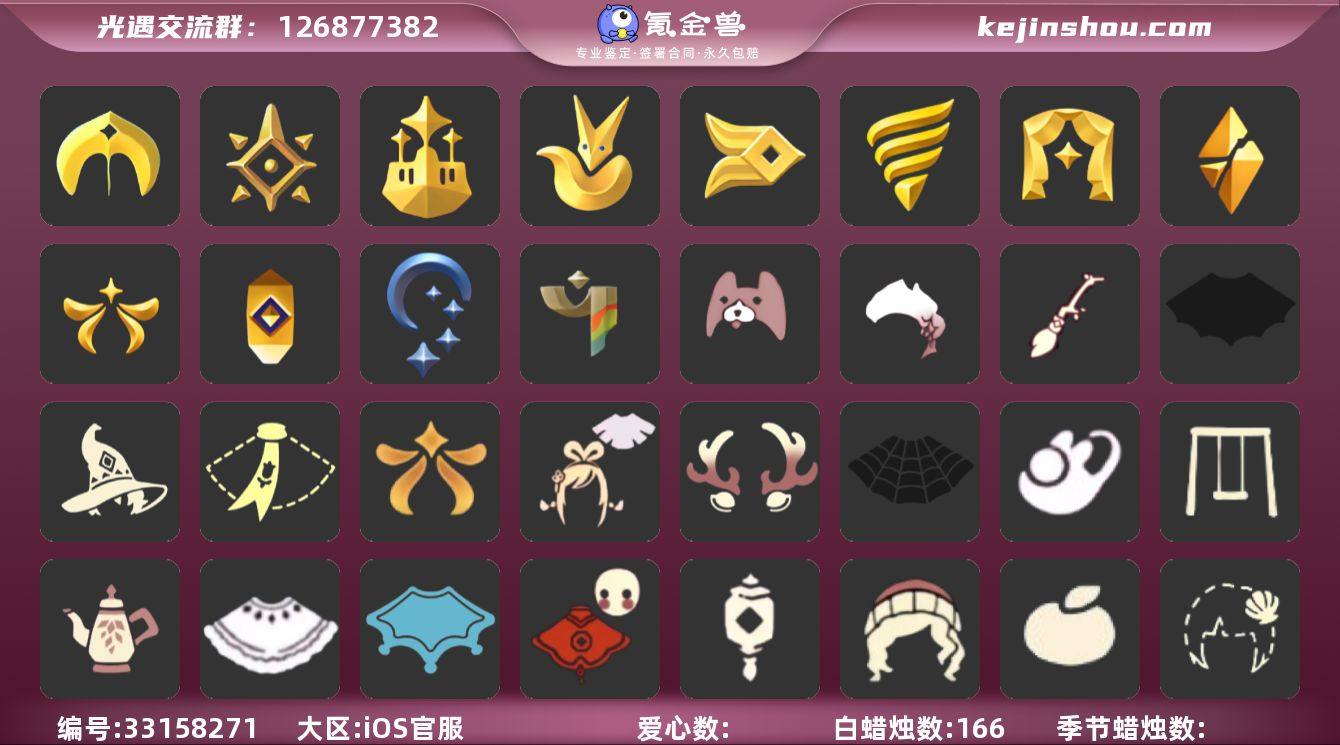 iOS官服 手机账号 5珍稀物品 13毕业季 6毕业图 166蜡烛 【珍稀物品】白枭(帝企鹅发),阿努比斯(狗头),玫瑰花,透明蝶翼斗,鳐鲲斗篷 【季节已毕业】圣岛季,预言季,梦想季,小王子季(王子季),风行季,潜海季,表演季,破晓季,欧若拉季(欧若拉),追忆季,夜行季,彩染季,迁徙季 【完成地图】晨岛,云野,雨林,霞谷,墓土(暮土),禁阁 【礼包】兔子鞋(兔子拖鞋),暗彩装扮(彩虹武士裤),周年影院套餐礼包,蝴蝶结(大蝴蝶结),水母(水母肩饰),冥龙套装礼包,活力海牛礼包,彩虹帽(多彩绒帽),巫师(巫师帽),蛛网朋克(蜘蛛朋克头),绊爱(绊爱斗篷)(绊爱礼包),橘子(大橘大利),小狗周年发饰(小狗周年头饰),雪花(雪花发夹),贝壳(贝壳发饰),兔子(玉兔头饰)(玉兔发饰)(兔子发饰),四叶草(四叶草头饰),彩虹耳钉(彩虹耳饰),彩虹耳机,枯角(巫树犄角),鹿角(圣诞鹿角),创始人(创始人斗篷),围巾(小王子斗篷)(小王子围巾),欧若拉之翼,福娃(福娃礼包)(春之日礼包)(铜钱斗),蝙蝠套(蝙蝠斗篷)(南瓜头),蜘蛛斗(蛛丝斗篷)(蛛网斗篷),透明蛛丝(透明蜘蛛斗),瑞雪(瑞雪斗篷)(暖冬瑞雪),白绒金(白雪斗篷),灯笼(中秋灯笼),恶作剧飞行扫帚,秋千(情人秋千),茶壶(小憩茶桌) 【裤子】风行毕业裤子(羽袖长袍),王子服(小王子套装),蓝绿...