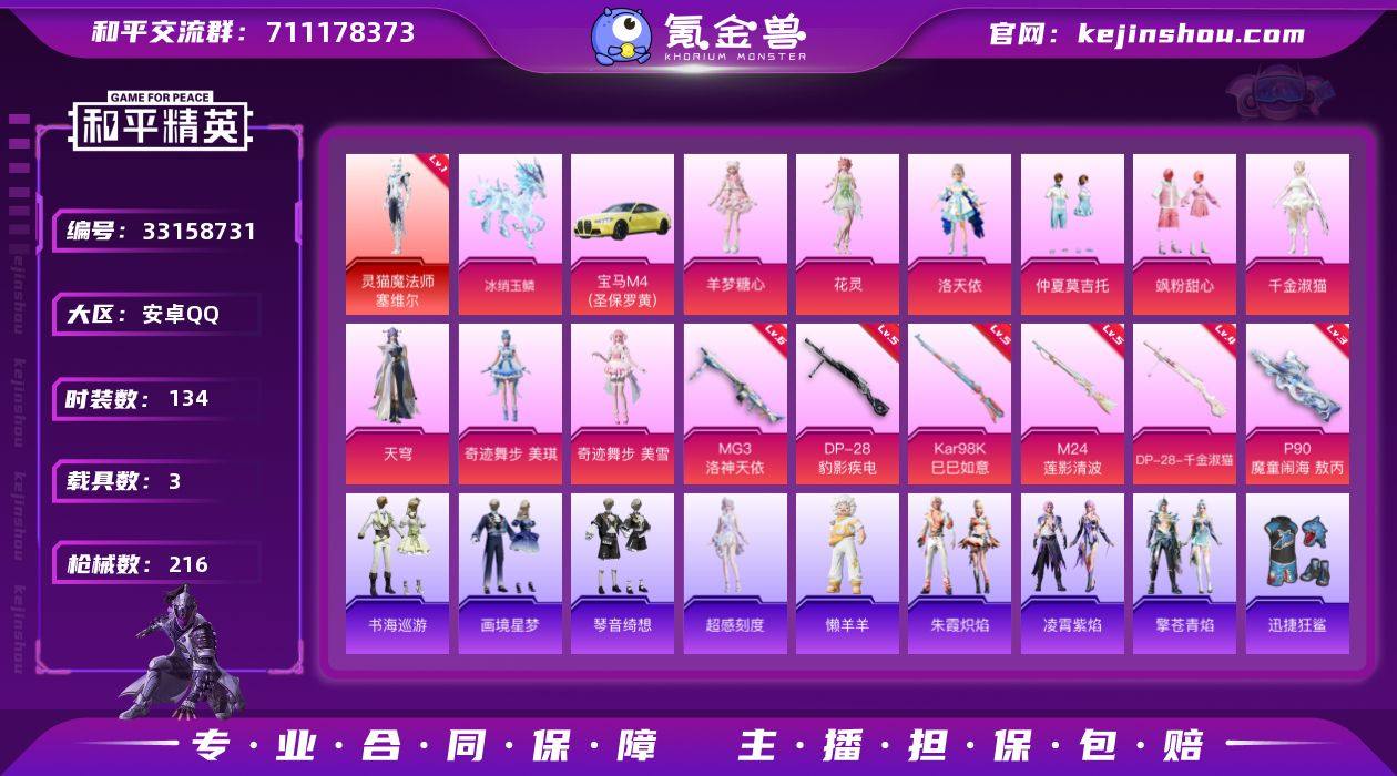 安卓 手Q-无敌战神框-2神装-11粉装-8特效枪-3载具-8粉色飞行器-70774热力值-13王牌印记-134套装-216枪皮老板!这边给到您回收价【】元!!!报价30分钟内有效,报价默认有二次无封号 冻结。 报价就是到手价,平台所有手续费费用均由我这边承担全程不脱离平台,高效率走流程,放款快!!QQ区换绑好10分钟内即可秒到账!! 老板!这边给到您回收价【】元!!!报价30分钟内有效,报价默认有二次无封号 冻结。 报价就是到手价,平台所有手续费费用均由我这边承担全程不脱离平台,高效率走流程,放款快!!QQ区换绑好10分钟内即可秒到账!! 【红色神装等级】:暮色玫影-艾丽娅(二级),灵猫魔法师-塞维尔(一级)【红色角色神装】:暮色玫影-艾丽娅,灵猫魔法师-塞维尔【热门品类】:套装-小丑鱼【粉色套装】:角色-洛天依,粉装-仲夏莫吉托,粉装-飒粉甜心,角色-千金淑猫,角色-天穹,角色-奇迹舞步 美琪,角色-奇迹舞步 美雪,角色-花灵,角色-羊梦糖心,人物-小舞·灵珑,角色-蜜语粉晶【粉色枪皮等级】:AKM-暮色玫影(三级),P90-魔童闹海 敖丙(三级),Kar98K-巳巳如意(五级),M24-莲影清波(五级),Mk14-福马献瑞(四级),DP-28-千金淑猫(四级),DP-28-豹影疾电(五级),MG3-洛神天依(六级)【粉色...