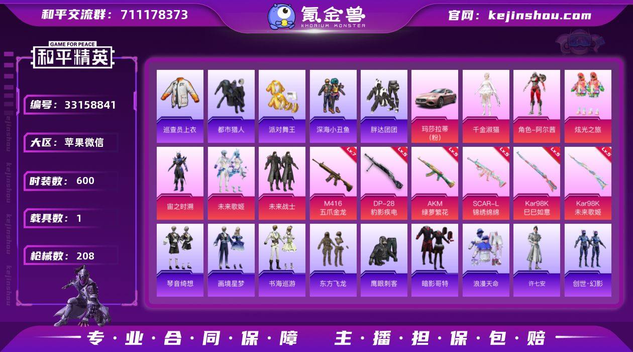 【特价出售】苹果V-5稀有1载具6粉装6特效枪12热门159套装208枪皮 66262热力值 16印记 历史超级王牌14星 【5稀有】 巡查衣 都市猎人 浪漫天命 派对舞王 派对舞王(金靴子) 【1载具】 玛莎拉蒂粉色 【6粉装】 千金淑猫 阿尔茜 未来歌姬 炫光之旅 宙之时溯 未来战士 【6特效枪】 M416-五爪金龙 (7级) SCAR-L-锦绣绵绵 (5级) AKM-绿萝繁花 (5级) Kar98K-巳巳如意 (5级) DP-28-豹影疾电 (5级) Kar98K-未来歌姬 (5级) 【12热门】 Mark.06 龟仙人 东方飞龙 鹰眼刺客 深海小丑鱼 胖达团团 诡面顽熊 暗影哥特 狂沙舞者 漫步者 破蛋小黄鸡 弄潮海豚 【1飞行器】 万古烈焰飞行器 【3头盔】 童趣迷兔头盔 深海小丑鱼头盔 金羽特工头盔 【2背包】 幻影战神背包 神秘黑猫背包