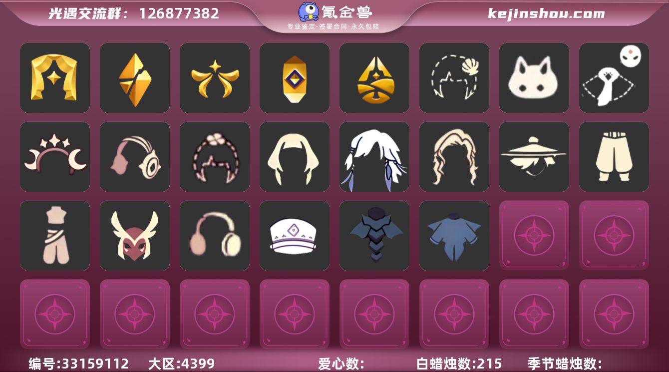 安卓官服 邮箱账号 3珍稀物品 5毕业季 1毕业图 215蜡烛 【珍稀物品】白枭(帝企鹅发),透明蝶翼斗,彩虹围巾(五塑彩带斗) 【季节已毕业】表演季,破晓季,欧若拉季(欧若拉),追忆季,归巢季 【完成地图】墓土(暮土) 【礼包】贝壳(贝壳发饰),兔子(玉兔头饰)(玉兔发饰)(兔子发饰),四叶草(四叶草头饰),星月头饰(星月头冠),彩虹耳机,猫套(皮皮猫斗)(皮皮猫礼包) 【裤子】蓝绿裤(高领舞服),武士裤 【面具】黄眉企鹅面具 【面饰】红耳机 【项链】围巾(肩带) 【发型】留辫蘑菇头,虚荣,归巢毕业发型(五塑彩羽发),若笠(箬笠) 【头饰】平顶帽 【斗篷】冥龙斗篷,燕尾斗篷,遥鲲斗篷(双翼遥鲲斗),绿芽,海洋斗 【配饰】鲲灯(追忆之书)