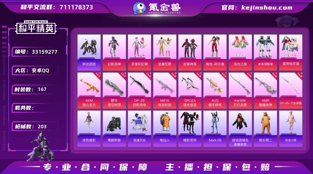 【特价出售/店主推荐】安卓 手Q-9粉装-12特效枪-69080热力值-9王牌印记-167套装-203枪皮 【热门品类】:套装-浪漫天命,套装-胖达团团,套装-龟仙人,套装-暗影哥特,角色-Mark.06,熔岩游骑兵连帽夹克 【粉色套装】:粉装-幻影战神,粉装-天使彩虹糖,粉装-金属狂野,粉装-放客神游,角色-阿尔茜,粉装-炫光之旅,粉装-未来领航者,粉装-星穹咏叹调 【粉色枪皮等级】:AKM-甜心宝贝(七级),M416-电玩时刻(五级),GROZA-镜光银凌(五级),AUG-暖羊咩咩(五级),UMP45-萌骑冒险(四级),野牛-青空秋雨(七级),AKS-74U-森灵之息(五级),Kar98K-巳巳如意(五级),Mk14-福马献瑞(五级),AMR-智耀战神(五级),DP-28-千金淑猫(五级),DP-28-豹影疾电(五级) 【粉色枪皮】:AKM-甜心宝贝,M416-电玩时刻,GROZA-镜光银凌,AUG-暖羊咩咩,UMP45-萌骑冒险,野牛-青空秋雨,AKS-74U-森灵之息,Kar98K-巳巳如意,Mk14-福马献瑞,AMR-智耀战神,DP-28-千金淑猫,DP-28-豹影疾电 【粉色降落伞】:幻影战神降落伞,梦幻火箭降落伞,星之彼岸降落伞,蓝莓炮弹降落伞,旋转彩虹降落伞,音爆索尼克降落伞,第五大道降落伞,蜜语绒猫降落伞,创世·救赎降落伞,英伦信使降落伞,未来领航者降落伞,临安...