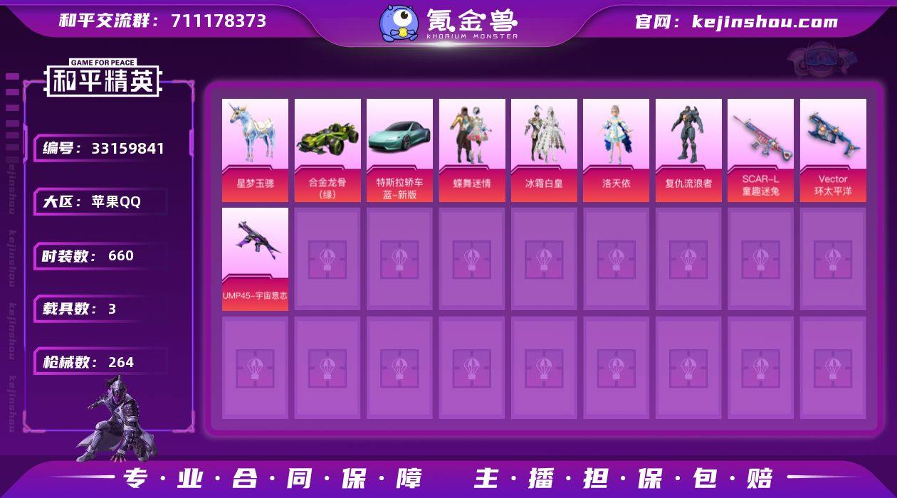【稀有枪皮】AKS-74U-星穹咏叹调,MK14-甜梦熊击,UMP45-宇宙意志,DP-28-千金淑猫,Kar98K-巳巳如意,AA12-G-萌骑幻想,ACE32-萌骑漫游,PKM-萌骑夺宝,SCAR-L-灵驹仙姬,UMP45-萌骑冒险,信号枪-金乌曜日,MK14-福马献瑞,AKS-74U-森灵之息,DP-28-豹影疾电,SCAR-L童趣迷兔,Vector环太平洋