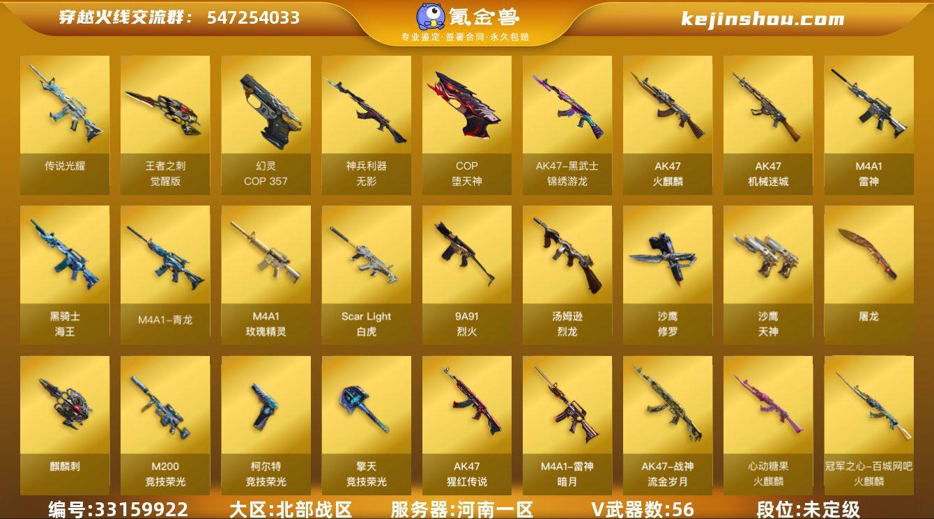 河南一区-72V-6王者武器数-0炫金武器数 【传说武器】:传说光耀 【热门武器】:传说光耀,Scar Light-白虎,M4A1-青龙,M200-竞技荣光,汤姆逊-烈龙*5,COP-堕天神,COP 357-幻灵,沙鹰-修罗*2 【王者炫金武器】:王者沧神 【音效卡】:屠龙-电竞之星-竞星跃动音效卡,AK47-火麒麟音效卡,Scar Light-白虎音效卡,HK417-朱雀-电竞之星-竞星跃动音效卡 【皮肤】:雷神-暗月,火麒麟-雷神,火麒麟-冠军之心,火麒麟-盘古,火麒麟-心动糖果,火麒麟-斗烈龙驹 皮肤,战神-流金岁月皮肤,修罗-能量核心,屠龙-春桃 皮肤,屠龙-定军扬威 皮肤 【角色】:电竞教官-云悠悠,太空指挥官,王者影豹,乔伊教练,修道士,云海玲珑,幻面灵狐,斗烈龙骑,暗夜-X,初恋灵狐,风暴女,嘉年华灵狐,兰-新年限定,灵狐者-职业经理,潘多拉-X,潘多拉-甜心教官,斯沃特-X,蜀雪,兔囡囡,新娜塔莎,团团 【人偶武器】:AWM-灵狐-15周年嘉年华*2,迷你深渊冰龙,迷你牛魔王,夺魂,迷你牛牛,灵狐娃娃手雷 【暴走生化】:超级对讲机 【挑战大师】:AK47-冰龙粉碎者,冰龙粉碎者-白马银枪,激光毁灭者III,阐释者III 【英雄级武器】:AK47-火麒麟,M4A1-雷神,AK47-机械迷城,M4A1-青龙,Scar Ligh...