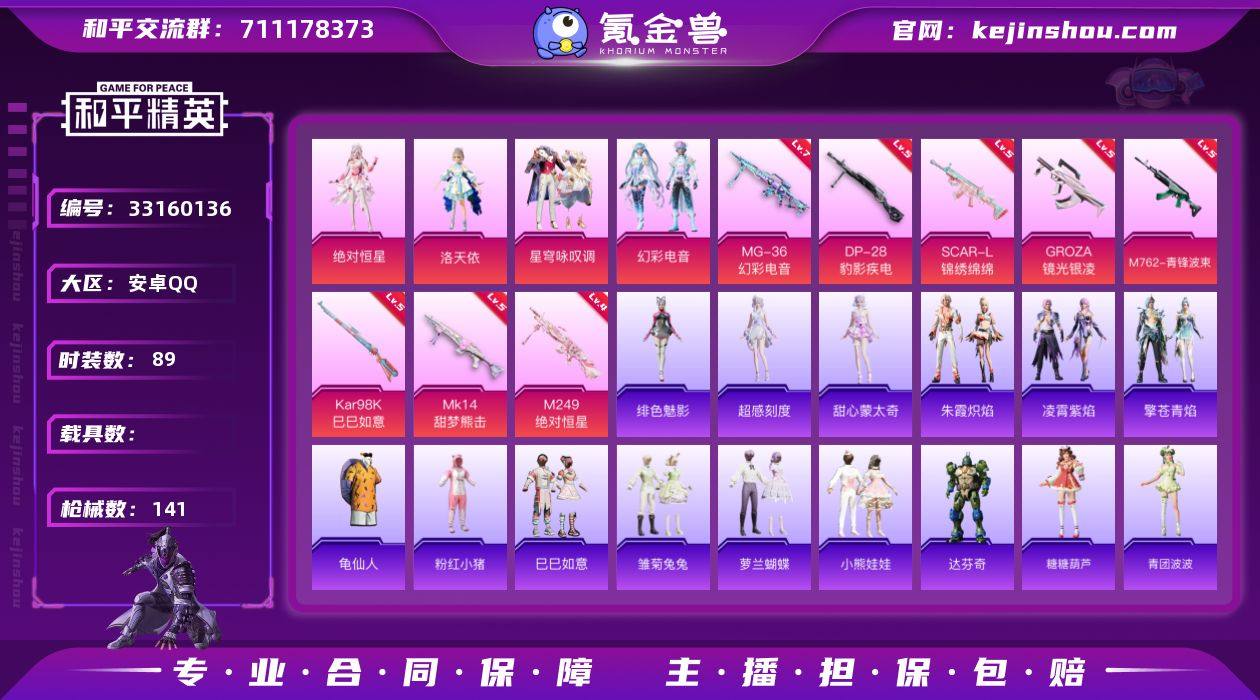 【948850】安卓 手Q-4粉装-8特效枪-0载具-1粉色飞行器-42444热力值-2王牌印记-89套装-141枪皮 【热门品类】:套装-龟仙人,套装-粉红小猪 【粉色套装】:角色-绝对恒星,角色-洛天依,粉装-星穹咏叹调,粉装-幻彩电音 【粉色枪皮等级】:SCAR-L-锦绣绵绵(五级),GROZA-镜光银凌(五级),M762-青锋波束(五级),Kar98K-巳巳如意(五级),Mk14-甜梦熊击(五级),M249-绝对恒星(四级),DP-28-豹影疾电(五级),MG-36-幻彩电音(七级) 【粉色枪皮】:SCAR-L-锦绣绵绵,GROZA-镜光银凌,M762-青锋波束,Kar98K-巳巳如意,Mk14-甜梦熊击,M249-绝对恒星,DP-28-豹影疾电,MG-36-幻彩电音 【粉色飞行器】:绝对恒星飞行器 【粉色降落伞】:绝对恒星降落伞,洛神天依降落伞,圣堂之誓降落伞,鬼刀降落伞,雪月幻音降落伞,幻彩电音降落伞 【稀有套装】:套装-龟仙人,套装-巳巳如意,角色-超感刻度,角色-甜心蒙太奇,套装-雪国风尚,套装-雏菊兔兔,套装-萝兰蝴蝶,套装-小熊娃娃,角色-达芬奇,套装-糖糖葫芦,套装-青团波波,套装-棉花软糖,角色-许七安,套装-燕燕于飞,套装-鱼渊荷华,套装-粉恋花,套装-紫幽梦,套装-蓝冰羽,套装-霓虹热舞,套装-极速光影,套装-彩虹兔,套装-云朵鹅...