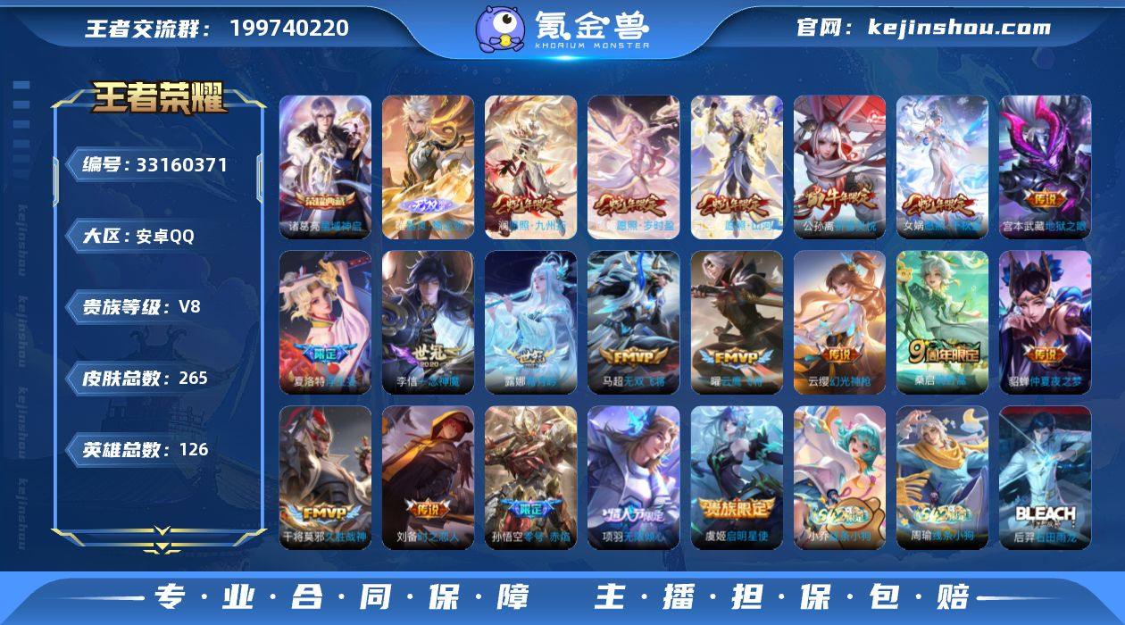 【948977】贵族8-贵族积分55615-265皮-1典藏-1无双-19传说-2全皮英雄-2改名卡 安卓手Q297区