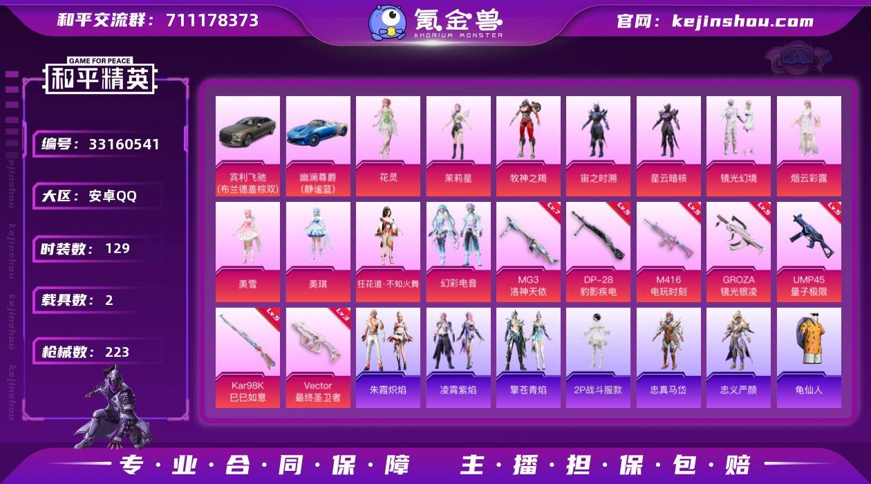 【948995】安卓 手Q-11粉装-7特效枪-2载具-6粉色飞行器-67496热力值-12王牌印记-129套装-223枪皮 【热门品类】:角色-2P战斗服款,角色-忠真马岱,角色-忠义严颜,套装-龟仙人,角色-8号机,角色-Mark.06,大砍刀-青龙偃月刀,撬棍-龙胆亮银枪 【粉色套装】:角色-茉莉星,粉装-牧神之羯,角色-宙之时溯,角色-星云暗核,粉装-镜光幻境,角色-烟云彩露,角色-美雪,角色-美琪,角色-狂花道·不知火舞,粉装-幻彩电音,角色-花灵 【粉色枪皮等级】:M416-电玩时刻(五级),GROZA-镜光银凌(五级),UMP45-量子极限(五级),Vector-最终圣卫者(三级),Kar98K-巳巳如意(五级),DP-28-豹影疾电(五级),MG3-洛神天依(七级) 【粉色载具】:宾利飞驰(布罗德盖棕双色),幽澜尊爵(静谧蓝) 【粉色枪皮】:M416-电玩时刻,GROZA-镜光银凌,UMP45-量子极限,Vector-最终圣卫者,Kar98K-巳巳如意,DP-28-豹影疾电,MG3-洛神天依 【粉色飞行器】:万古烈焰飞行器,霓虹漫游飞行器,星空武士飞行器,龙翔九天飞行器,幻海精灵飞行器,灵猫魔法师飞行器 【粉色降落伞】:梦幻火箭降落伞,闲梦青缨降落伞,炫光之旅降落伞,万古烈焰降落伞,莲影清波降落伞,龙行天下降落伞,圣堂之誓降落伞,镜...