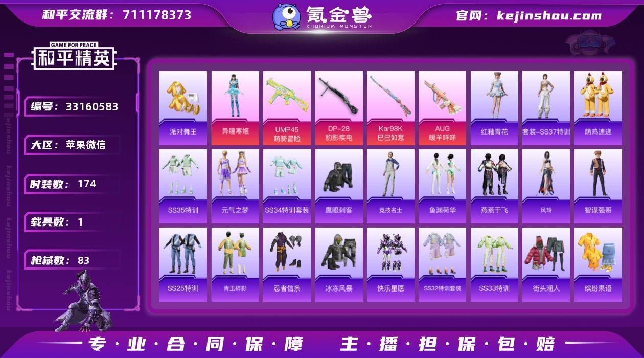 AL696847 【学生党专属】 热力值21544 枪皮数量83 粉装数1 套装数量41 时装数174 载具数1 战备数47 【是本人】 【可排位】 【包人脸】 【是】 【支持】 【未绑定或可换绑】 【无换绑CD】 【是】 其他武器皮肤63 头盔20 动作12 伙伴1 其他武器皮肤:M16A4-千金淑猫,M16A4-雨过天青,M16A4-冰河战士,AKM-破晓战魂,AKM-霓彩脉冲,AUG-耀粉歌者,AUG-甜蜜菠萝,SCAR-L-红色方程式,SCAR-L-彩虹符号,SCAR-L-净心行者,M762-天降萌叽,M762-奇异狩猎者,M416-红色方程式,M416-蓝色火焰,AC-VAL-天降萌叽,AC-VAL-乌木金纹,GROZA-福马献瑞,Famas-霓彩脉冲,Mk47-洛神天依,蜜獾-启元战纹,M200-乌木金纹,AMR-雨过天青,AWM-雷霆特警,AWM-天降萌叽,Mini14-乌木金纹,SLR-霓彩脉冲,SLR-金丰海韵,Mk14-阳光菠萝,Mk14-冰河战士,Mini14-耀粉歌者,MK20-H-乌木金纹,MK20-H-狂鲨锋刃,汤姆逊-樱桃泡泡,UZI-冰河战士,UZI-幻影战神,P90-巳巳如意,P90-乌木金纹,AKS-74U-乌木金纹,AKS-74U-鬼刀,UMP45-绒宝小鹅,野牛-燕燕于飞,Vector-燕燕于飞,Vector-彩虹符号,DBS-乌木金纹,S686-彩虹符号,S686-奇异狩猎者,AA12-G-雨过天青,S12K-霓彩脉冲,S12K-玩趣呆呆,S12K-破...