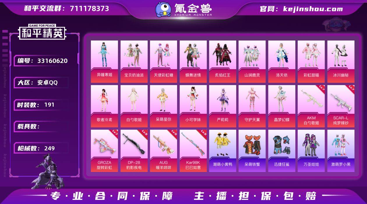 【948974】安卓 手Q-16粉装-6特效枪-0载具-3粉色飞行器-84503热力值-20王牌印记-191套装-249枪皮 【热门品类】:套装-浪漫天命,套装-龟仙人,套装-潮萌小黄鸭,套装-暗影哥特 【粉色套装】:粉装-宝贝奶油派,粉装-天使彩虹糖,粉装-蝶舞迷情,粉装-炙焰红王,粉装-山涧鹿灵,角色-洛天依,粉装-彩虹甜喵,粉装-冰川幽秘,角色-歌者泠鸢,角色-白勺歌姬,角色-呆萌星弥,角色-小可学妹,角色-严莉莉,角色-守护天翼,角色-晶梦幻蝶,角色-异瞳寒姬 【粉色枪皮等级】:AKM-白勺歌姬(七级),SCAR-L-纯梦嫁纱(七级),GROZA-旋转彩虹(七级),AUG-暖羊咩咩(五级),Kar98K-巳巳如意(五级),DP-28-豹影疾电(五级) 【粉色枪皮】:AKM-白勺歌姬,SCAR-L-纯梦嫁纱,GROZA-旋转彩虹,AUG-暖羊咩咩,Kar98K-巳巳如意,DP-28-豹影疾电 【粉色飞行器】:炫彩糖果飞行器,冰川粉黛飞行器,绝色倾城飞行器 【粉色降落伞】:粉色回忆降落伞,春暖花开降落伞,银刃赛罗降落伞,恐龙拽拽降落伞,橘柚倾心降落伞,筑梦精灵降落伞,妙趣可丽降落伞,彩虹甜喵降落伞,旋转彩虹降落伞,仲夏莫吉托降落伞,飒粉甜心降落伞,白勺歌姬降落伞,未来歌姬降落伞,精灵梦叶罗丽降落伞,千金淑猫降落伞,星穹...