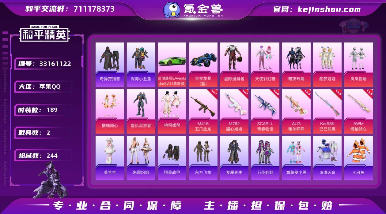 【949197】苹果 手Q-8粉装-6特效枪-2载具-2粉色飞行器-79052热力值-15王牌印记-189套装-244枪皮 【热门品类】:套装-浪漫天命,套装-深海小丑鱼,套装-小丑鱼,套装-奇异狩猎者,套装-暗影哥特,套装-粉红小猪,熔岩游骑兵连帽夹克 【粉色套装】:粉装-星际漫游者,粉装-天使彩虹糖,粉装-暗夜玫瑰,粉装-酣梦娃娃,粉装-岚岚物语,粉装-橘柚倾心,角色-复仇流浪者,粉装-桃粉嫣然 【粉色枪皮等级】:SCAR-L-青春物语(六级),M416-五爪金龙(七级),AUG-暖羊咩咩(五级),M762-甜心娃娃(七级),Kar98K-巳巳如意(五级),AWM-橘柚倾心(五级) 【粉色载具】:兰博基尼Aventador SVJ(翡翠绿),合金龙骨(蓝) 【粉色枪皮】:SCAR-L-青春物语,M416-五爪金龙,AUG-暖羊咩咩,M762-甜心娃娃,Kar98K-巳巳如意,AWM-橘柚倾心 【粉色飞行器】:炫彩糖果飞行器,齐天大圣飞行器 【粉色降落伞】:炫紫旋律降落伞,夏日绵绵冰降落伞,星之彼岸降落伞,齐天大圣降落伞,洛神天依降落伞,甜心娃娃降落伞,青春物语降落伞,橘柚倾心降落伞,筑梦精灵降落伞,炫彩糖果降落伞 【稀有套装】:套装-巳巳如意,套装-紫幽梦,套装-蓝冰羽,套装-朱霞炽焰,玩偶服-美羊羊 【稀有枪皮】:AKM-冰凉西瓜...