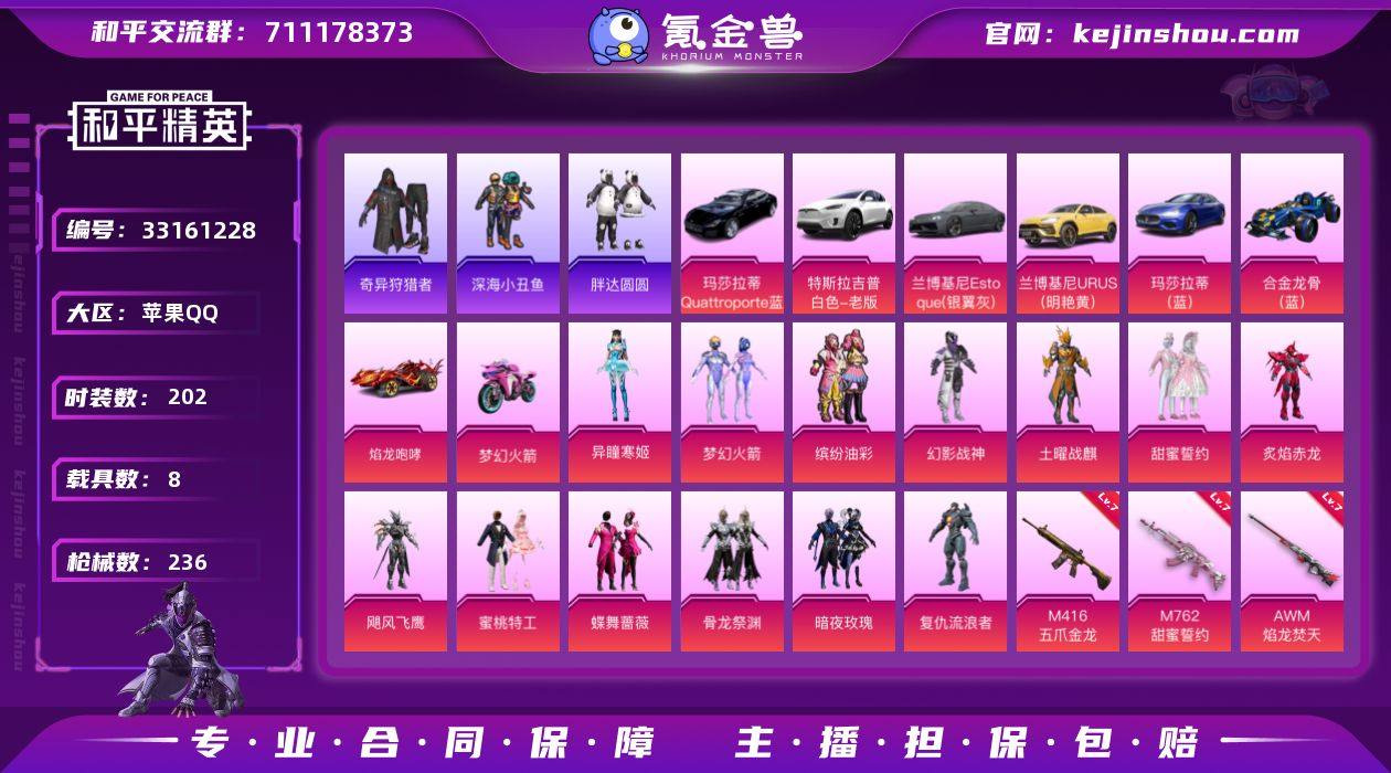 【949278】苹果 手Q-13粉装-6特效枪-8载具-4粉色飞行器-91875热力值-4王牌印记-202套装-236枪皮 【热门品类】:粉装-梦幻火箭,粉装-缤纷油彩,套装-浪漫天命,套装-深海小丑鱼,套装-小丑鱼,套装-奇异狩猎者,角色-军刀雅典娜,套装-胖达圆圆,套装-黄金大亨,套装-AG战队服,套装-SS1特训,套装-龟仙人,套装-暗影哥特,套装-浪漫波比,套装-萌熊伴侣,熔岩游骑兵连帽夹克 【粉色套装】:粉装-幻影战神,粉装-土曜战麒,粉装-梦幻火箭,粉装-缤纷油彩,粉装-甜蜜誓约,粉装-炙焰赤龙,粉装-飓风飞鹰,粉装-蜜桃特工,粉装-蝶舞蔷薇,粉装-骨龙祭渊,粉装-暗夜玫瑰,角色-复仇流浪者,角色-异瞳寒姬 【粉色枪皮等级】:M416-五爪金龙(七级),M762-甜蜜誓约(七级),Kar98K-巳巳如意(五级),AWM-焰龙焚天(七级),Mk14-福马献瑞(五级),DP-28-豹影疾电(五级) 【粉色载具】:特斯拉Model X(珍珠白),兰博基尼Estoque(银翼灰),兰博基尼URUS(明艳黄),玛莎拉蒂Quattroporte(夜幕蓝),玛莎拉蒂Ghibli(蓝),合金龙骨(蓝),焰龙咆哮,双人摩托-梦幻火箭,僚机-萌兔起飞 【粉色枪皮】:M416-五爪金龙,M762-甜蜜誓约,Kar98K-巳巳如意,AWM-焰龙焚天,Mk14-福马献瑞,DP-...