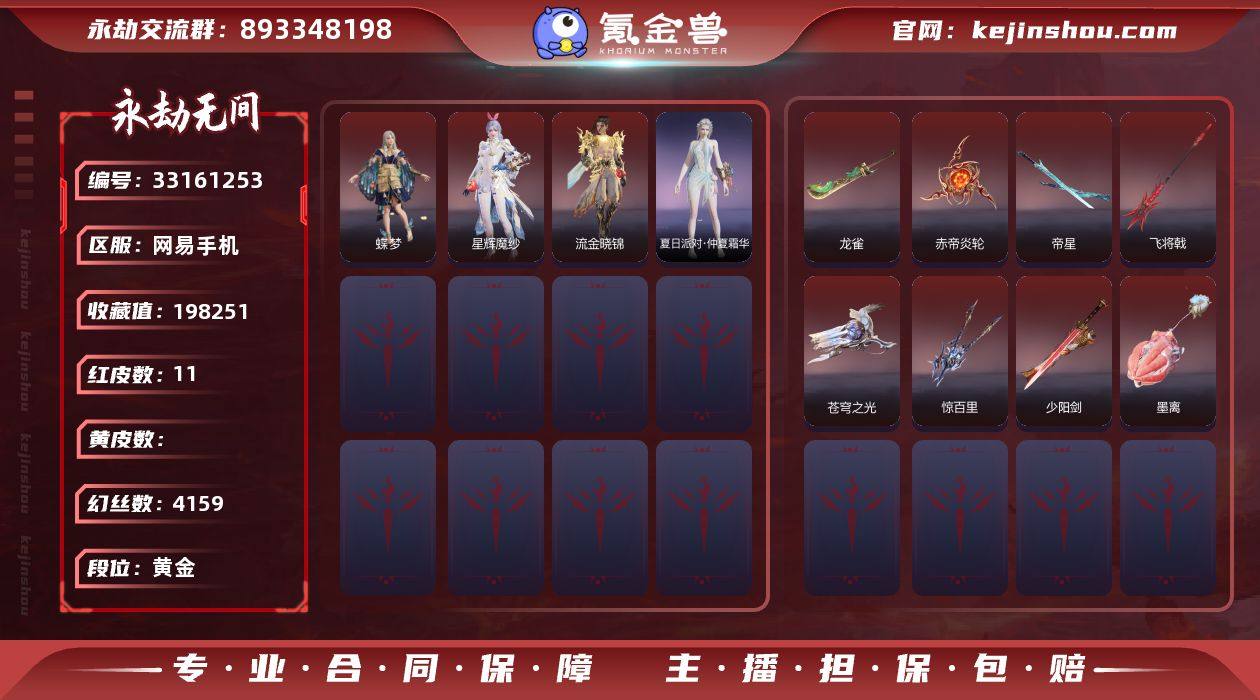 WJ5810,网易手机,4月23可换绑,三人段位黄金4,声望1,11红,246金,等级251,收藏值198251,幻丝4159,金砖39,通行证Lv1,变身器,葫芦兄弟宝葫芦,红色神品,墨离,星辉魔纱,流金晓锦,蝶梦,苍穹之光,赤帝炎轮,帝星,龙雀,飞将戟,少阳剑,惊百里,角色金色皮肤,黄庭道,梨园传奇柳生,封神录申公豹,朝闻道,封神录龙吉公主,夏日派对仲夏霜华,麟鹿大铠,千秋匠心玉叶景,浣烟纱,瀚海苍鹰,葫芦兄弟蛤蟆头领,街头狂欢不败擂主,干将莫邪,护世四法持国天王,赤阳天狐,封神录妲己,日影花阴,楚韵九歌云中君,观山海文鳐,湛卢,赤诚心,封神录姜子牙,云间影,天虹咏,觉明尊者,九骊之君,开辟鸿蒙风雨谐,铸神天禄瑞光,斗罗大陆唐三,沙狼之怒,追猎,巨阙,游四海,碧水青天,洛天依星空投影,贵胄少女,妖刀姬,阿娜希塔,楚韵九歌湘夫人,赤雾烟霞,麒麟牙,观山海朱明,解腕钉,灵木角,藤魂,长虹,建木,宝月琉璃,打狗棒,曼提柯尔之牙,仙舞,华夏神兵马首刀,青峰叠扇,拳皇舞扇,耀夜流华,九霄寒,蛋仔派对咸鱼,怨憎,无救,破重云,2674原型,巫师3湖女之剑,亢龙,光影裁决,隐天渊,