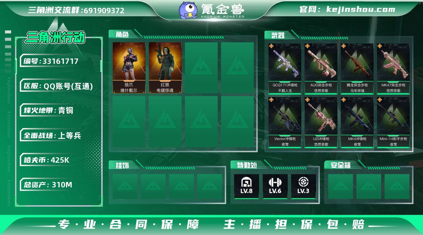 【SJZS1457】总资产(M):310M/哈夫币(K):425K/哈夫币(K):425K/传说枪皮数:26/全面战场等级:37_段位:上等兵/烽火地带等级:60_段位:青铜/骇爪-维什戴尔/红狼-电锯惊魂/近战-黑鹰/M4A1突击步枪-阿米娅/ASh-12战斗步枪-鹅鸭杀/K416突击步枪-行动记录/AUG突击步枪-悠然茶歇/SCAR-H战斗步枪-水墨云图/SCAR-H战斗步枪-启航/CAR-15突击步枪-阿米娅/腾龙突击步枪-马年祥瑞/腾龙突击步枪-万金泪冠/KC17突击步枪-电锯惊魂/MK47突击步枪-悠然茶歇/Vector冲锋枪-夜莺/UZI冲锋枪-悠然茶歇/勇士冲锋枪-万金泪冠/QCQ171冲锋枪-鹅鸭杀/QCQ171冲锋枪-不羁人生/MK4冲锋枪-夜莺/QJB201轻机枪-鹅鸭杀/Mini-14射手步枪-夜莺/M14射手步枪-缄花/SKS射手步枪-骑士/SR-25射手步枪-缄花/R93狙击步枪-维什戴尔/AWM狙击步枪-万金泪冠/.357左轮-缄花/G18-马年祥瑞/SR-25射手步枪-天命(典藏)/KC17突击步枪-碎冰行动(典藏)/QBZ95-1突击步枪-曙光/K416突击步枪-冬日风情/AUG突击步枪-蝮蛇/SG552突击步枪-深海恐惧/SG552突击步枪-哈夫克警备/G3战斗步枪-哈夫克警备/腾龙突击步枪-猎鳄行动/MP5冲锋枪-战术竞备/SR-3M紧凑突击步枪-战术竞备/勇士冲锋枪-深海恐惧/MP7冲锋枪-六套之力/SVD狙击步枪-阿萨拉工艺/...