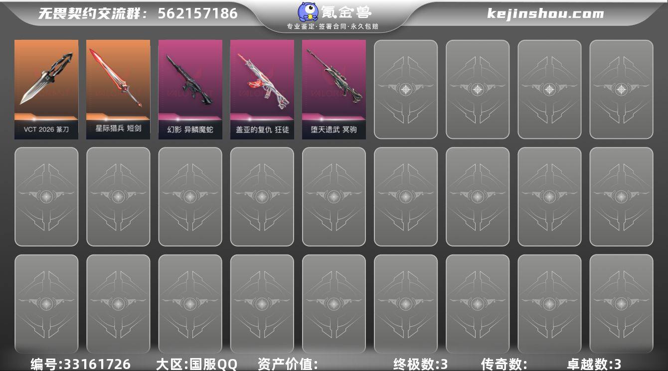 【套装】:VCT 2026 赛季套装 【英雄】:幻棱,炼狱,暮蝶,壹决,铁臂,捷风,雷兹,幽影,不死鸟,贤者,猎枭,蝰蛇,零,芮娜,尚勃勒,霓虹,斯凯,夜露,星礈,K/O,海神,盖可,黑梦,钢锁 【近战武器】:近战武器-VCT 2026 篆刀,近战武器-星际猎兵 短剑 【狂徒】:狂徒-盖亚的复仇 【幻影】:幻影-异鳞魔蛇 【冥驹】:冥驹-堕天遗武 【骇灵】:骇灵-无限竞技 【正义】:正义-传奇制造 【卡面】:无畏契约:暮蝶 卡面,树懒大作战 卡面,Clutch 卡面,无畏契约:尚勃勒 卡面,无畏契约GO!第一卷:芮娜 卡面,无畏契约GO!第一卷:零 卡面,无垠星环 卡面,《双城之战》金克丝 卡面,钢锁vs盖可 卡面,别冒尖 卡面,代号红色 卡面,新兵报到 卡面,V契约 卡面,无畏契约 卡面 【喷漆】:伤心心 喷漆,审判之爪 喷漆,分身有术 喷漆,致命优雅 喷漆,霓光四射 喷漆,买装还是存钱 喷漆,关门放狗 喷漆,红鳞 喷漆,无畏契约GO!第一卷:贤者 喷漆,松叶 喷漆,放下武器 喷漆,胜利属于无畏契约 喷漆,GLHF 喷漆,无畏契约 喷漆 【挂饰】:无畏契约GO!第一卷 零 挂饰,天外飞客 挂饰,《双城之战》魄罗 挂饰,海豹的认可 挂饰,无畏契约 纪念币 挂饰