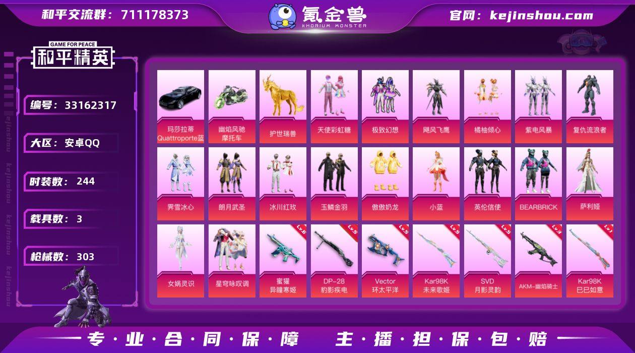 J2217 【精品衣柜号】17粉 10特 3载 小丑鱼 浪漫波比 浪漫天命 暗影哥特 复仇流浪者 天使彩虹糖 女娲灵石 萨利娅 小蓝 星穹叹咏调 英伦信使 满级枪*2 安卓 手Q-17粉装-10特效枪-3载具-11粉色飞行器-97787热力值-19王牌印记-244套装-303枪皮 【热门品类】:套装-浪漫天命,套装-小丑鱼,角色-军刀雅典娜,套装-忍者信条,套装-暗夜行者,角色-2P战斗服款,角色-忠猛周仓,套装-龟仙人,套装-暗影哥特,套装-浪漫波比,套装-粉红小猪,角色-Mark.06,大砍刀-青龙偃月刀,撬棍-龙胆亮银枪 【粉色套装】:粉装-天使彩虹糖,粉装-极致幻想,粉装-飓风飞鹰,粉装-橘柚倾心,粉装-紫电风暴,角色-复仇流浪者,粉装-霁雪冰心,粉装-朗月武圣,粉装-冰川红玫,粉装-玉鳞金羽,粉装-傲傲奶龙,角色-小蓝,粉装-英伦信使,粉装-BEARBRICK,角色-萨利娅,角色-女娲灵识,粉装-星穹咏叹调 【粉色枪皮等级】:AKM-幽焰骑士(三级),蜜獾-异瞳寒姬(六级),Vector-环太平洋(五级),AKS-74U-森灵之息(五级),Kar98K-未来歌姬(五级),Kar98K-巳巳如意(一级),SVD-月影灵韵(五级),DP-28-豹影疾电(五级) 【粉色载具】:玛莎拉蒂Quattroporte(夜幕蓝),幽焰风驰摩托车,护世瑞兽 【粉色枪皮】:...