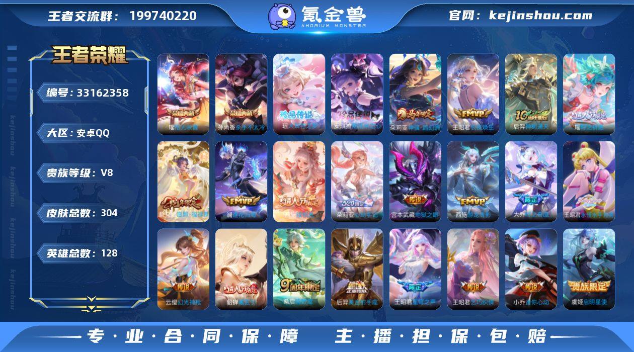 实名: 可修改 性别: 女号 贵族等级: V8 英雄数: 128 皮肤数: 304 荣耀水晶: 杀手不太冷,拾光映像 珍品传说: 酷洛米之心,大耳狗之梦 传说皮: 黄金射手座,黄金白羊座,音你心动-小乔,地狱之眼,飞鸢探春,乞巧织情,游龙清影,大乔-时之奇旅,永恒水手月亮,小动物乐团,澜逐花归海,貂蝉曦玄引,朵莉亚心动手记,幻光神枪,续相思,神树通天,长夜焕生,神骥·鸣幻洲 限定皮: 遇见飞天,白鹤梁神女,魔法小厨娘,朱雀志,凤凰于飞,时之祈愿-瑶,时之奇旅-妲己,星穹之声,五谷丰年,山海·碧波行,至美·乘鲤谣,鸣野蒿,陌上桑,逐霄战戟,愿照·福禄聚 亮点: 【优质装备】:杀手不太冷,拾光映像(瑶典藏),酷洛米之心,大耳狗之梦,黄金射手座,黄金白羊座,音你心动-小乔,地狱之眼,飞鸢探春,乞巧织情,游龙清影(小青龙),大乔-时之奇旅,永恒水手月亮,小动物乐团,澜逐花归海,朵莉亚心动手记,涂山容容