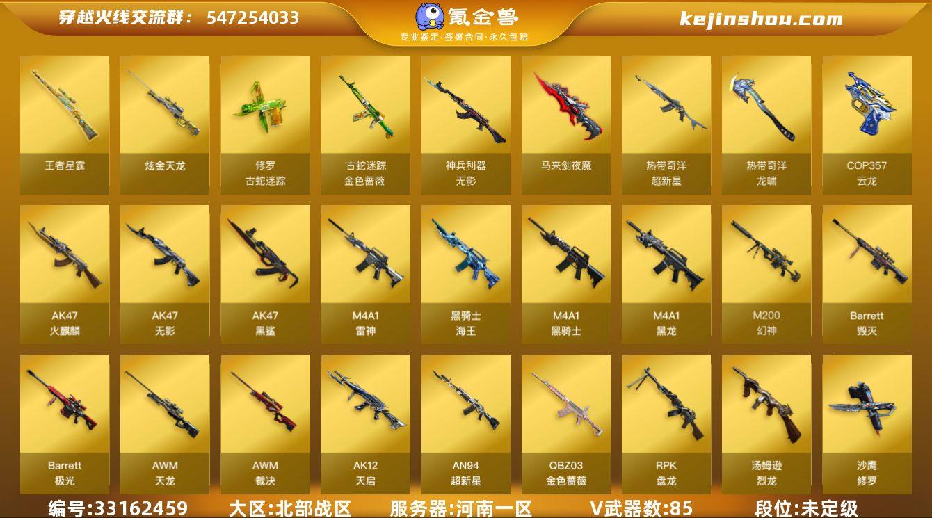 河南一区-85V-3王者武器数-1炫金武器数 【热门武器】:QBZ03-金色蔷薇,M200-幻神,金色蔷薇-古蛇迷踪,修罗-古蛇迷踪,死亡之眼,M4A1-黑骑士*5,汤姆逊-烈龙*6,RPK-盘龙*3,斯泰尔-蝴蝶,USP-雷暴,沙鹰-修罗*3 【王者炫金武器】:王者星霆,王者之魄闪光弹,炫金天龙 【音效卡】:AK47-火麒麟音效卡,M4A1-雷神音效卡,Barrett-毁灭音效卡,Barrett-极光音效卡 【皮肤】:幻神-冠军之幻,幻神-宠儿-2021MVP,幻神-电流骇客 皮肤,雷神-暗月,雷神-能量核心,雷神-荣耀之魄,雷神-冠军之魄,AK47-火麒麟-传奇EVEN,火麒麟-心动糖果,毁灭-荣耀之怒,毁灭-AG-CFPLS15冠军,毁灭-SV-CFPLS16冠军,黑龙-能量核心,黑骑士-冠军之势,无影耀金皮肤,天龙-秘银,AWM-天龙-传奇白鲨,屠龙-荣耀之锋*2 【角色】:零,樱,隼,审判者,蛇隐宗,奇洋探员,云海玲珑,暗夜-X,初恋灵狐,飞虎队-X,嘉年华灵狐,娟娟,兰-海滩派对,兰-新年限定,零-水下丽影,灵狐者-X,龙儿,龙儿-小淘气,曼陀罗-X,潘多拉-X,潘多拉-甜心教官,邱刚敖,青霞仙子,蛇姬,斯沃特-X,蜀雪,铁骑荣耀,新娜塔莎,雪莉杨,影武者-X,幽,游珑儿 【人偶武器】:斯泰尔-蝴蝶,AWM-灵狐-15周年嘉年华,迷你...
