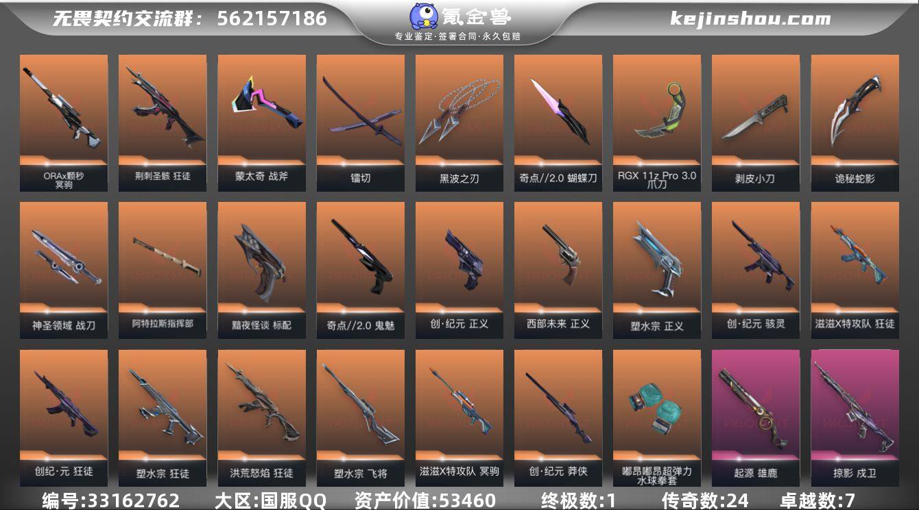 段位: 黄金 套装: 创·纪元套装,滋滋X特工队 近战武器皮肤: 剥皮小刀-异形猎人,黑波之刃-塑水宗,爪刀-RGX 11z Pro 3.0,蝴蝶刀-奇点//2.0,镭切-创·纪元,神圣领域 战刀,诡秘蛇影,阿特拉斯指挥部,嘟昂嘟昂超弹力水球拳套-滋滋X特攻队,蒙太奇 战斧 步枪皮肤: 狂徒-紫阙金琅,幻影-侦察力量,狂徒-塑水宗,狂徒-洪荒怒焰,狂徒-海洋之星,狂徒-掠影,戍卫-掠影,狂徒-创·纪元,狂徒-离子武器2.0,狂徒-滋滋X特攻队,超集系统 狂徒,蒙太奇 幻影,风暴之子 戍卫,狂徒-荆刺圣骸 佩枪皮肤: 正义-塑水宗,标配-黯夜怪谈,鬼魅-奇点//2.0,正义-创·纪元,正义-西部未来,超集系统 标配,风暴之子 正义,蒙太奇 狂怒 狙击枪皮肤: 飞将-塑水宗,莽侠-创·纪元,冥驹-滋滋X特攻队,冥驹-ORAx颗秒,风暴之子 冥驹,超集系统 飞将 冲锋枪皮肤: 骇灵-创·纪元,蒙太奇 骇灵 霰弹枪皮肤: 雄鹿-起源,风暴之子 雄鹿 机枪皮肤: 蒙太奇 战神 亮点: 【优质装备】:狂徒-塑水宗,狂徒-掠影,狂徒-紫阙金琅,幻影-侦察力量,正义-塑水宗,狂徒-洪荒怒焰,戍卫-掠影,剥皮小刀,黑波之刃,飞将-塑水宗,爪刀-RGX 11z Pro 3.0,鬼魅-奇点//2.0,蝴蝶刀-奇点//2.0,镭切,神圣领域 战刀,诡秘蛇影,阿特拉斯指挥部,雄鹿-起源