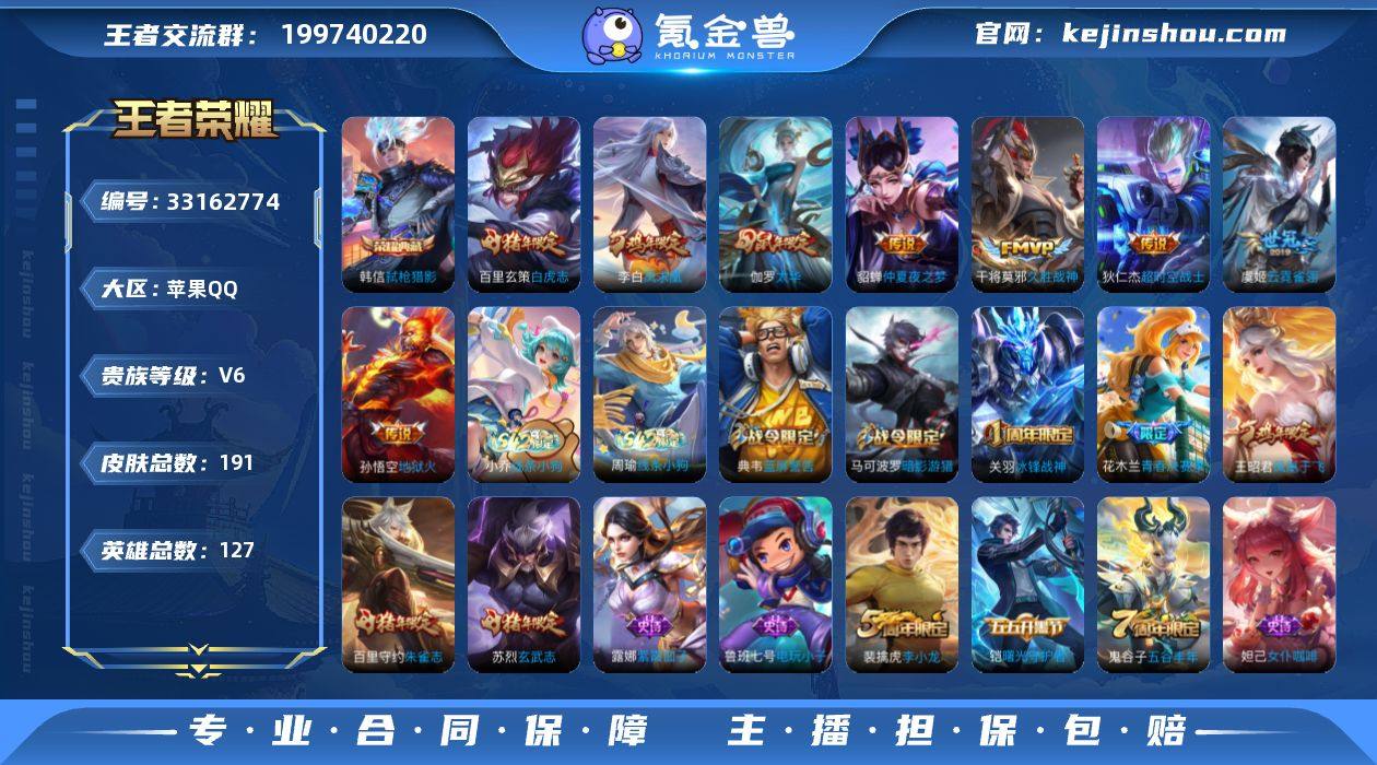 实名: 可修改 性别: 女号 贵族等级: V6 英雄数: 127 皮肤数: 191 荣耀水晶: 弑枪猎影 传说皮: 久胜战神,云霓雀翎,地狱火,仲夏夜之梦,超时空战士-狄仁杰 限定皮: 冰锋战神,遇见飞天,李小龙,游园惊梦,梁祝,玄嵩,太华,青春决赛季,逐梦之影,凤求凰,白虎志,玄武志,朱雀志,凤凰于飞,五谷丰年 亮点: 【优质装备】:弑枪猎影(韩信典藏),久胜战神,云霓雀翎,地狱火,仲夏夜之梦(大飞蛾),超时空战士-狄仁杰