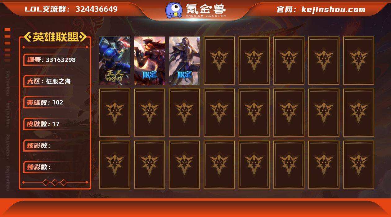 【LOLF2958】102英雄/17皮肤/3限定/7史诗/未定级/胜利女神 希维尔/胜利枪神 卢锡安/防暴天使 凯尔/天人合一 易/圣洁化身 索拉卡/三昧真火 孙悟空/防弹武僧 李青/地下拳王 李青/冰川勇者 伊泽瑞尔/西部牛仔 亚索/暗影易/星战易/尼斯巨兽科加斯/三叶草墨菲特/战神阿瑞斯盖伦/失落大陆菲兹/坚韧不屈沃利贝尔
