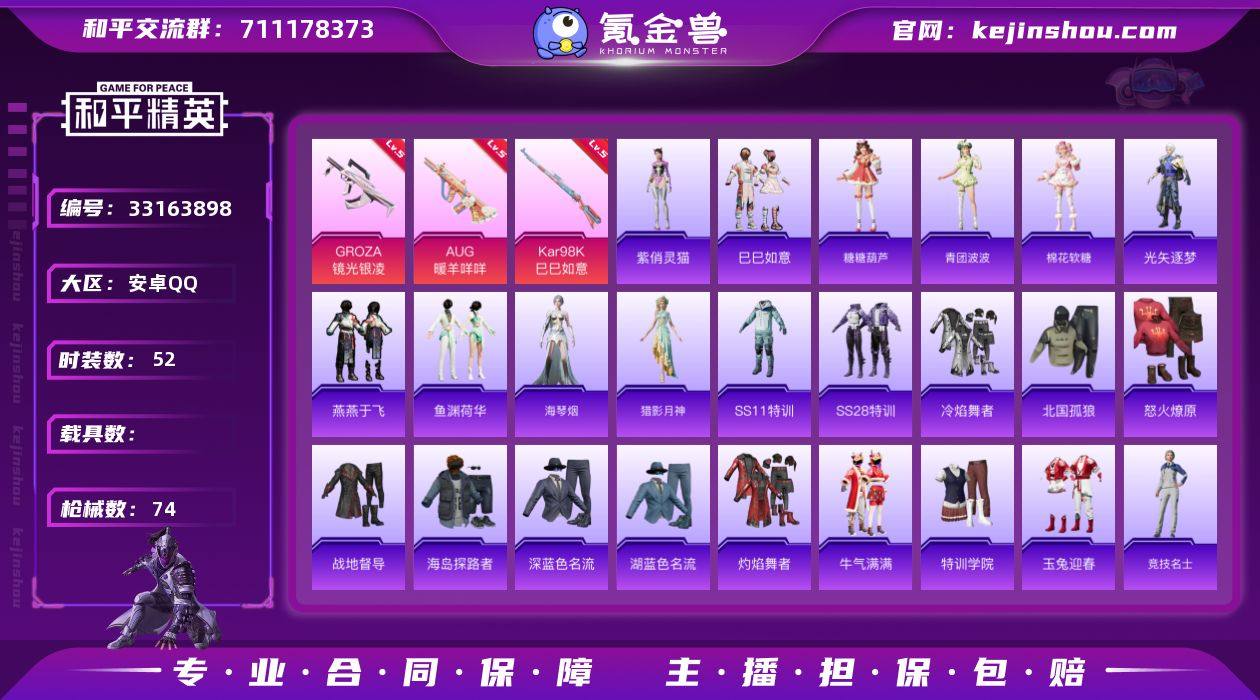 安卓 手Q-1粉装-4特效枪-0载具-2粉色飞行器-22243热力值-2王牌印记-52套装-74枪皮 【粉色套装】:角色-罪夜之冕 【粉色枪皮等级】:GROZA-镜光银凌(五级),AUG-暖羊咩咩(五级),Kar98K-巳巳如意(五级),Mk14-福马献瑞(五级) 【粉色枪皮】:GROZA-镜光银凌,AUG-暖羊咩咩,Kar98K-巳巳如意,Mk14-福马献瑞 【粉色飞行器】:炫彩糖果飞行器,彩虹独角兽飞行器 【粉色降落伞】:脆鲨七海降落伞,动力核心降落伞,鬼刀降落伞,月下星之子降落伞,炫彩糖果降落伞,辉云木星降落伞 【稀有套装】:套装-巳巳如意,套装-马上来财,套装-糖糖葫芦,套装-青团波波,套装-棉花软糖,角色-光矢逐梦,套装-燕燕于飞,套装-鱼渊荷华,角色-海琴烟,角色-猎影月神,角色-紫俏灵猫,角色-幽雨猫猫 【稀有枪皮】:M16A4-信仰神谕,SCAR-L-炫彩节奏,M762-绯红前夜,AC-VAL-天降萌叽,UZI-天降萌叽,UZI-生命誓言,UZI-红色方程式,UZI-金风玉露,UZI-月影灵韵,UMP45-生命誓言,汤姆逊-天降萌叽,汤姆逊-耀粉歌者,AKS-74U-鬼刀,P90-巳巳如意,M24-炫彩节奏,SKS-炫彩节奏,Mini14-耀粉歌者,M417-虹云熊熊,M417-蓝晶绮麟,S686-红色方程式,S686-巳巳如意,S12K-智耀战神,DBS-彩虹符号,MG3...
