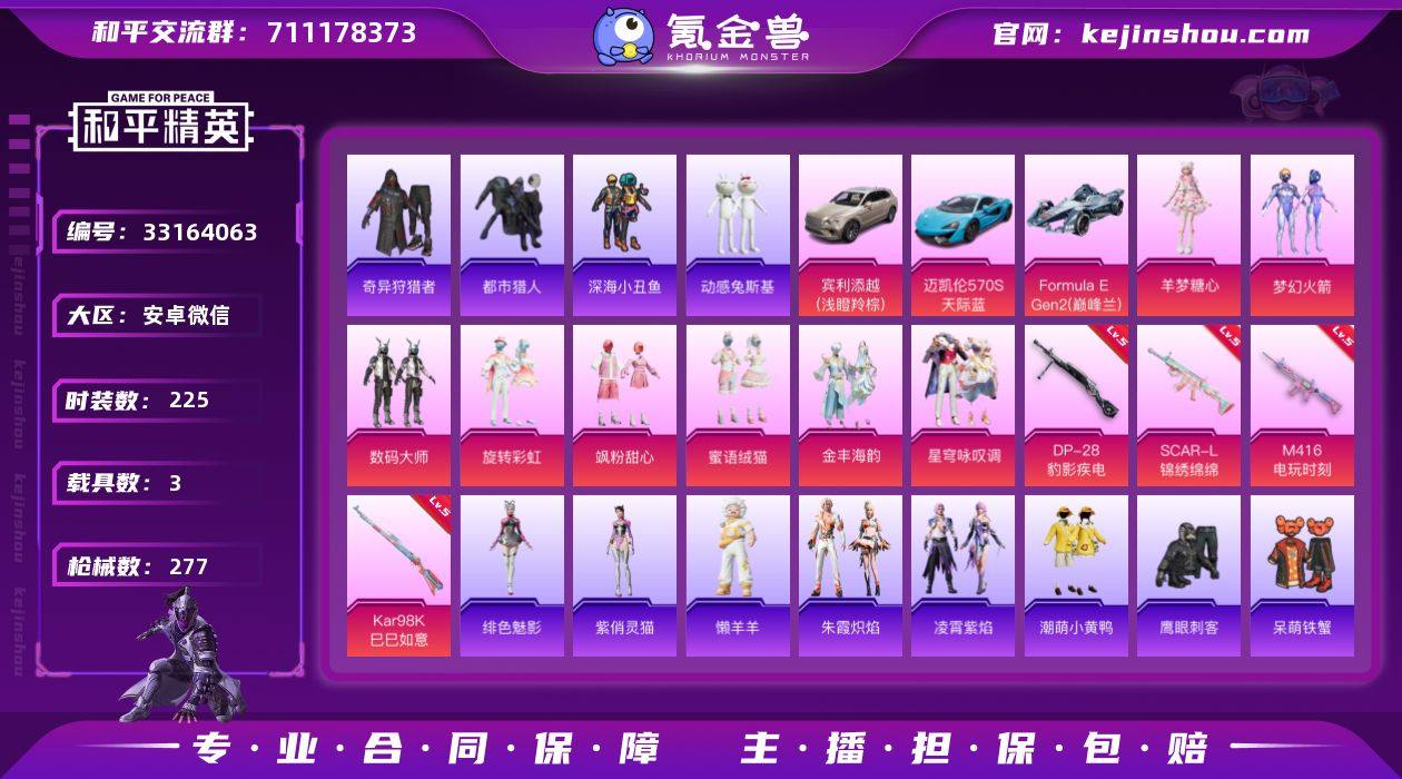 安卓 微信-8粉装-5特效枪-3载具-2粉色飞行器-88041热力值-13王牌印记-225套装-277枪皮 【热门品类】:粉装-梦幻火箭,套装-浪漫天命,套装-都市猎人,套装-深海小丑鱼,套装-奇异狩猎者,套装-动感兔斯基人偶服,角色-2P战斗服款,套装-龟仙人,套装-潮萌小黄鸭,套装-暗影哥特,套装-粉红小猪,角色-Mark.06 【粉色套装】:粉装-数码大师,粉装-梦幻火箭,粉装-旋转彩虹,粉装-飒粉甜心,粉装-蜜语绒猫,粉装-金丰海韵,粉装-星穹咏叹调,角色-羊梦糖心 【粉色枪皮等级】:SCAR-L-锦绣绵绵(五级),M416-电玩时刻(五级),ACE32-萌骑漫游(五级),Kar98K-巳巳如意(五级),DP-28-豹影疾电(五级) 【粉色载具】:宾利添越(浅瞪羚棕),迈凯伦570S(天际蓝),Formula E Gen2(巅峰兰) 【粉色枪皮】:SCAR-L-锦绣绵绵,M416-电玩时刻,ACE32-萌骑漫游,Kar98K-巳巳如意,DP-28-豹影疾电 【粉色飞行器】:炫彩糖果飞行器,梦幻火箭飞行器 【粉色降落伞】:梦幻火箭降落伞,恐龙拽拽降落伞,橘柚倾心降落伞,彩虹甜喵降落伞,旋转彩虹降落伞,音爆索尼克降落伞,白勺歌姬降落伞,炎氏战神降落伞,未来歌姬降落伞,闲梦青缨降落伞,莲影清波降落伞,圣堂之誓降落伞,江南烟雨降落伞,...