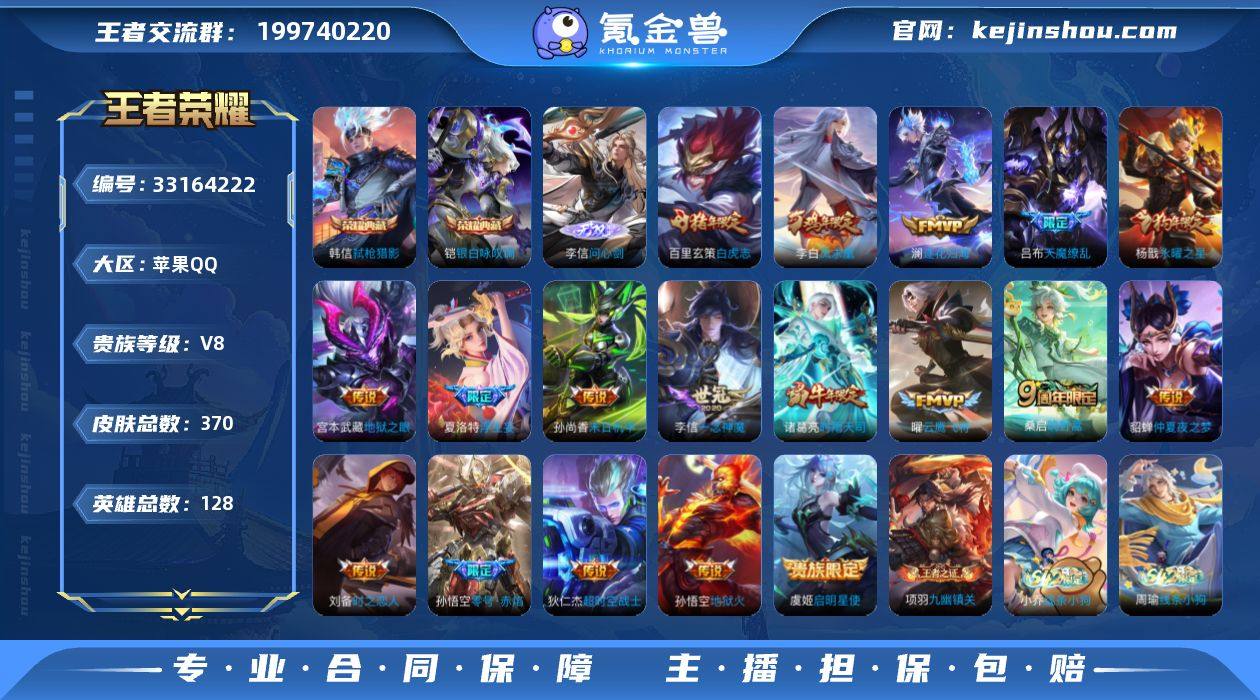 实名: 可修改 贵族等级: V8 英雄数: 128 皮肤数: 370 荣耀水晶: 银白咏叹调,弑枪猎影 无双皮: 问心剑 传说皮: 云鹰飞将,一念神魔,末日机甲-孙尚香,地狱火,仲夏夜之梦,零号·赤焰,地狱之眼,时之恋人-刘备,超时空战士-狄仁杰,浮生妄,澜逐花归海 限定皮: 冰锋战神,遇见飞天,李小龙,游园惊梦,梁祝,时雨天司,白鹤梁神女,白晶晶,岱宗,天魔缭乱,神威,永曜之星,时之彼端,飞衡,逐梦之音,冰霜恋舞曲,逐梦之星,逐梦之光,凤求凰,白虎志,青龙志,朱雀志,一生所爱,大圣娶亲,默契交锋-花木兰,霸王别姬-项羽,霸王别姬-虞姬,高山流水,孙行者,猪悟能,鸣野蒿