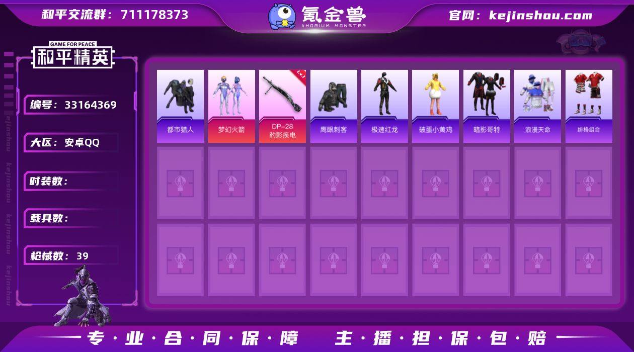 WJ875【1粉装 2特效 梦幻火箭 都市猎人 红眼罩】安卓手Q-1粉装-2特效枪-37套装-39枪皮-3王牌印记-不朽星钻Ⅳ-11282热力值【1粉装】梦幻火箭【2特效枪】Mk14-福马献瑞[5级],DP-28-豹影疾电[5级]【4稀有】都市猎人,暗影哥特,NV战队服,浪漫天命【4飞行器】异域银装飞行器,鸡智如我飞行器,马上有福飞行器,梦幻火箭飞行器【1头盔】梦幻火箭头盔【2背包】梦幻火箭背包,深海小丑鱼背包【69其它衣服和枪皮】疯狂小兔子,鹰眼刺客,红釉青花,狙击之神,绯格组合,青翼流星,黑色伏地魔,SS37特训,完美偶像,绮丽涂鸦,SS33特训,雨过天青,竞技名士,马上有钱,元气之梦,萌鸡速递,SS36特训,云魄琉璃,极速红龙,顶瓜瓜,黄色运动,SS34特训,薄荷星砂,旭日情侣,魅力单车,角色-枫露凝珀,蓝彩潮人,破蛋小黄鸡,红色运动,长空猛禽,SS35特训,幻影武者,M417-玩趣呆呆,AA12-G-雨过天青,DBS-幻彩电音,DBS-荧海星豚,ACE32-冰晶雪宝,Kar98K-梦幻火箭,MG3-幻世战舞者,烟雾弹-冰氧夏日,沙漠之鹰-雨过天青,破片手榴弹-拽到爆炸,Famas-霓彩脉冲,SKS-迅猛狂鲨,20-H-狂鲨锋刃,燃烧瓶-福马献瑞,SPAS-12-狂鲨锋刃,PKM-雨过天青,十字弩-异瞳寒姬,AWM-天降萌叽,汤姆逊-天降萌叽,Mini14-穿刺龙虾,M16A4-雨过天青,汤姆逊-像素花...