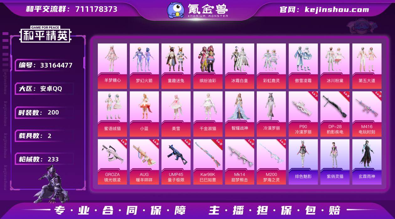【精品妹妹号】20粉13特2载具 红熊茄茄 糯粉咩咩 梦幻火箭 童趣迷兔 缤纷油彩 小舞 满级冷漠罗丽 霜月冰狼 九霄玄鹿 安卓 手Q-20粉装-13特效枪-2载具-8粉色飞行器-80856热力值-12王牌印记-200套装-233枪皮 【热门品类】:粉装-梦幻火箭,粉装-童趣迷兔,粉装-缤纷油彩,套装-浪漫天命,套装-AG战队服,套装-龟仙人,套装-糯粉咩咩,角色-Mark.06,套装-红熊茄茄 【粉色套装】:粉装-梦幻火箭,粉装-缤纷油彩,粉装-冰霜白皇,粉装-童趣迷兔,粉装-彩虹鹿灵,粉装-傲雪凌霜,粉装-冰川粉黛,粉装-第五大道,粉装-蜜语绒猫,角色-小蓝,角色-美雪,角色-千金淑猫,角色-智耀战神,角色-冷漠罗丽,角色-羊梦糖心,角色-罪夜之冕,角色-花中眠,角色-月中灵,人物-小舞·灵珑,角色-蜜语粉晶 【粉色枪皮等级】:UMP45-霜月狼主(三级),M416-电玩时刻(五级),GROZA-镜光银凌(五级),AUG-暖羊咩咩(五级),ACE32-萌骑漫游(三级),UMP45-量子极限(五级),AKS-74U-森灵之息(五级),P90-冷漠罗丽(七级),Kar98K-巳巳如意(五级),Mk14-甜梦熊击(五级),Mk14-福马献瑞(五级),M200-梦海之灵(三级),DP-28-豹影疾电(五级) 【粉色载具】:九霄玄鹿,霜月冰狼 【粉色枪皮】:M416-电玩时刻,GR...