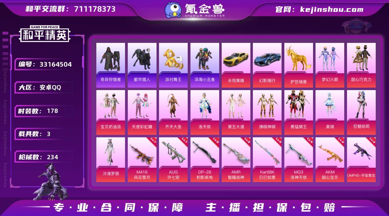 精品身法号 12粉15特3载具 派对舞王 暗夜之虎 都市猎人 暗夜哥特 深海小丑鱼 甜心巧克力 梦幻火箭 3级沙丘之主 金马 安卓 手Q-12粉装-15特效枪-3载具-10粉色飞行器-81247热力值-14王牌印记-178套装-234枪皮 【热门品类】:粉装-梦幻火箭,套装-浪漫天命,套装-都市猎人,套装-派对舞王,套装-深海小丑鱼,套装-小丑鱼,套装-奇异狩猎者,角色-军刀雅典娜,角色-忠义严颜,套装-暗夜之虎,套装-龟仙人,套装-暗影哥特,角色-Mark.06 【粉色套装】:粉装-甜心巧克力,粉装-宝贝奶油派,粉装-天使彩虹糖,粉装-梦幻火箭,粉装-齐天大圣,角色-洛天依,粉装-第五大道,粉装-拂晓神骑,粉装-勇猛狮王,角色-美琪,角色-狂魅哈莉,角色-冷漠罗丽 【粉色枪皮等级】:AKM-甜心宝贝(三级),M416-风花雪月(七级),AUG-许七安(七级),UMP45-宇宙意志(三级),AKS-74U-森灵之息(五级),P90-沙丘之主(三级),Kar98K-巳巳如意(四级),Mk14-福马献瑞(五级),AMR-智耀战神(五级),AA12-G-萌骑幻想(三级),DP-28-豹影疾电(五级),MG3-洛神天依(四级),信号枪-金乌曜日(二级),燃烧瓶-天降桃花(三级),破片手榴弹-招财进宝(三级) 【粉色载具】:永恒黄蜂,幻影随行,护世瑞兽 【粉色枪皮】:AKM-...