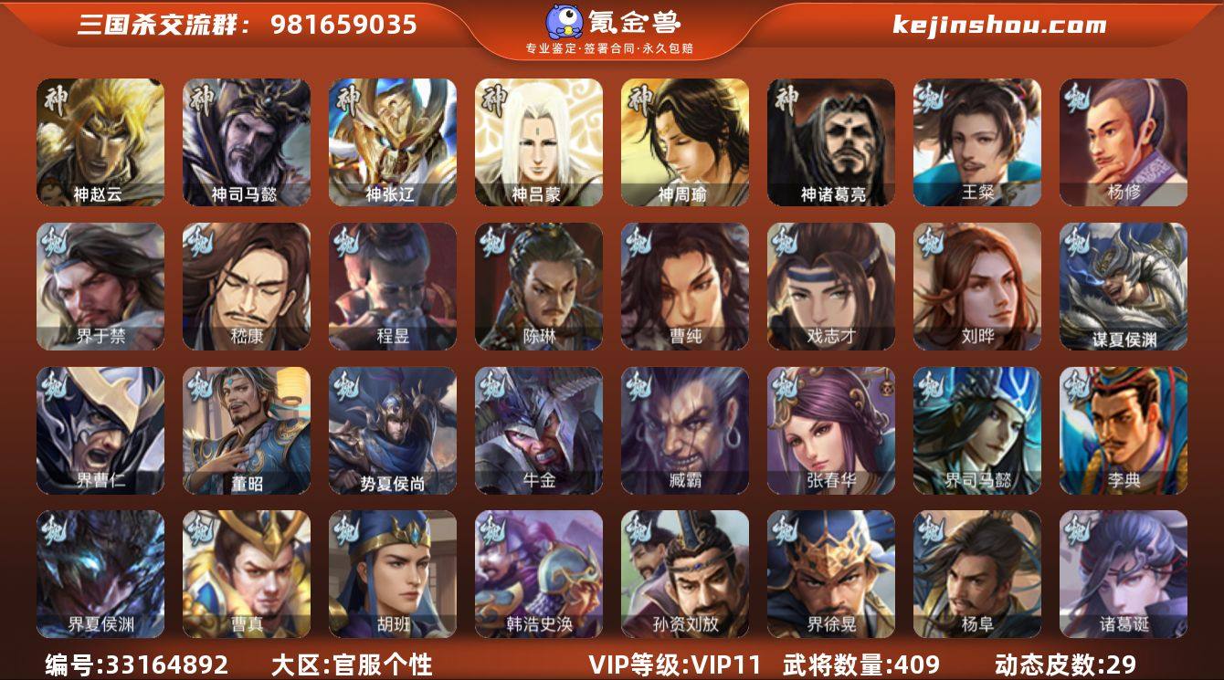 官阶:大将军;VIP等级:VIP11;史诗武将数量:48;动态皮肤数量:29;武将总数:409;史诗宝珠数量:1;将魂数量:1778;神将:4;魏国史诗武将:23;蜀国史诗武将:10;吴国史诗武将:7;群史诗武将:19
