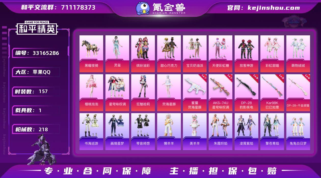 10998精品少萝号 13粉7特1载具 小舞 甜心巧克力 猪脸 萌物绒绒 led眼镜 樱桃泡泡 2把满级枪 黑曜夜骑苹果 手Q-13粉装-7特效枪-1载具-5粉色飞行器-68722热力值-8王牌印记-157套装-218枪皮 【热门品类】:粉装-缤纷油彩,套装-浪漫天命,套装-糯粉咩咩,套装-软软马卡龙 【粉色套装】:粉装-甜心巧克力,粉装-宝贝奶油派,粉装-天使彩虹糖,粉装-缤纷油彩,粉装-放客神游,粉装-彩虹甜喵,粉装-萌物绒绒,角色-樱桃泡泡,粉装-星穹咏叹调,角色-狂魅哈莉,角色-荧海星豚,角色-灵玺,人物-小舞·雪昙 【粉色枪皮等级】:蜜獾-荧海星豚(七级),AKS-74U-星穹咏叹调(七级),Kar98K-巳巳如意(五级),Mk14-福马献瑞(五级),AA12-G-萌骑幻想(五级),DP-28-千金淑猫(四级),DP-28-豹影疾电(五级) 【粉色载具】:黑曜夜骑 【粉色枪皮】:蜜獾-荧海星豚,AKS-74U-星穹咏叹调,Kar98K-巳巳如意,Mk14-福马献瑞,AA12-G-萌骑幻想,DP-28-千金淑猫,DP-28-豹影疾电 【粉色飞行器】:炫彩糖果飞行器,镜光幻境飞行翼,雀灵庇佑飞行器,时光之吻飞行器,灵猫魔法师飞行器 【粉色降落伞】:甜心宝贝降落伞,萌物绒绒降落伞,创世·救赎降落伞,鬼刀降落伞,彩虹独角兽降落伞,星穹咏叹调降落伞,...