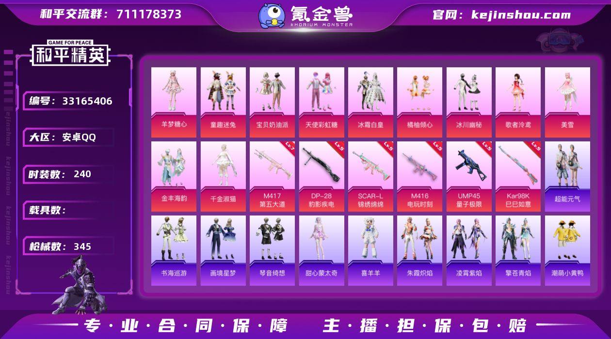 h11011妹妹号 12粉 10特 童趣迷兔 千金淑猫 暗影哥特 晶辉守护 奶油梦幻熊 兔兔白日梦 两把7级枪 安卓 手Q-12粉装-10特效枪-0载具-2粉色飞行器-100343热力值-18王牌印记-240套装-345枪皮 【热门品类】:粉装-童趣迷兔,套装-浪漫天命,套装-龟仙人,套装-潮萌小黄鸭,套装-暗影哥特 【粉色套装】:粉装-宝贝奶油派,粉装-天使彩虹糖,粉装-冰霜白皇,粉装-童趣迷兔,粉装-橘柚倾心,粉装-冰川幽秘,角色-歌者泠鸢,角色-美雪,粉装-金丰海韵,角色-千金淑猫,角色-羊梦糖心,角色-霁蓝缠春 【粉色枪皮等级】:SCAR-L-锦绣绵绵(五级),M416-电玩时刻(五级),ACE32-萌骑漫游(五级),UMP45-量子极限(五级),AKS-74U-森灵之息(五级),Kar98K-巳巳如意(五级),Mk14-辉云木星(七级),Mk14-福马献瑞(一级),M417-第五大道(七级),DP-28-豹影疾电(五级) 【粉色枪皮】:SCAR-L-锦绣绵绵,M416-电玩时刻,ACE32-萌骑漫游,UMP45-量子极限,AKS-74U-森灵之息,Kar98K-巳巳如意,Mk14-辉云木星,Mk14-福马献瑞,M417-第五大道,DP-28-豹影疾电 【粉色飞行器】:炫彩糖果飞行器,翎光蝶翼飞行器 【粉色降落伞】:绝对恒星降落伞,甜心宝贝降落伞,春暖花开降落伞,PEL轰鸣竞梦者降落伞,童...
