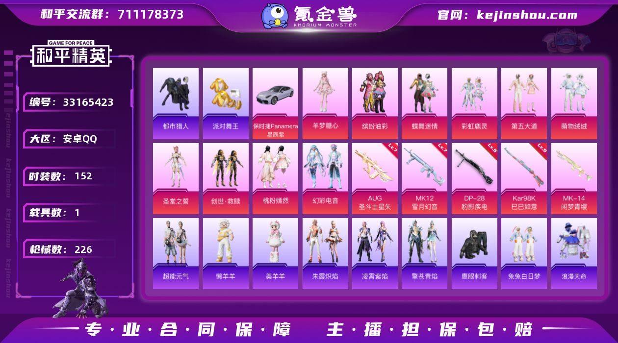 h10983妹妹号 11粉 9特 1载具 缤纷油彩 萌物绒绒 派对舞王 蝶舞迷情 虹云熊熊 红熊茄茄 都市猎人 兔兔白日梦 三把7级枪 保时捷 安卓 手Q-11粉装-9特效枪-1载具-4粉色飞行器-75175热力值-13王牌印记-152套装-226枪皮 【热门品类】:粉装-缤纷油彩,套装-浪漫天命,套装-都市猎人,套装-派对舞王,套装-龟仙人,套装-红熊茄茄 【粉色套装】:粉装-蝶舞迷情,粉装-缤纷油彩,粉装-彩虹鹿灵,粉装-第五大道,粉装-萌物绒绒,角色-圣堂之誓,套装-创世·救赎,粉装-桃粉嫣然,粉装-幻彩电音,角色-羊梦糖心,角色-虹云熊熊 【粉色枪皮等级】:AUG-圣斗士星矢(七级),ACE32-萌骑漫游(二级),AKS-74U-森灵之息(五级),Kar98K-巳巳如意(五级),Mk14-福马献瑞(五级),MK12-雪月幻音(七级),DP-28-豹影疾电(五级),PKM-萌骑夺宝(二级) 【粉色载具】:保时捷Panamera(星辰紫) 【粉色枪皮】:AUG-圣斗士星矢,ACE32-萌骑漫游,AKS-74U-森灵之息,Kar98K-巳巳如意,Mk14-闲梦青缨,Mk14-福马献瑞,MK12-雪月幻音,DP-28-豹影疾电,PKM-萌骑夺宝 【粉色飞行器】:炫彩糖果飞行器,萌物绒绒飞行器,彩虹独角兽飞行器,月下星之子飞行器 【粉色降落伞】:龙虾霸霸降落伞,第五大道降落伞,未...