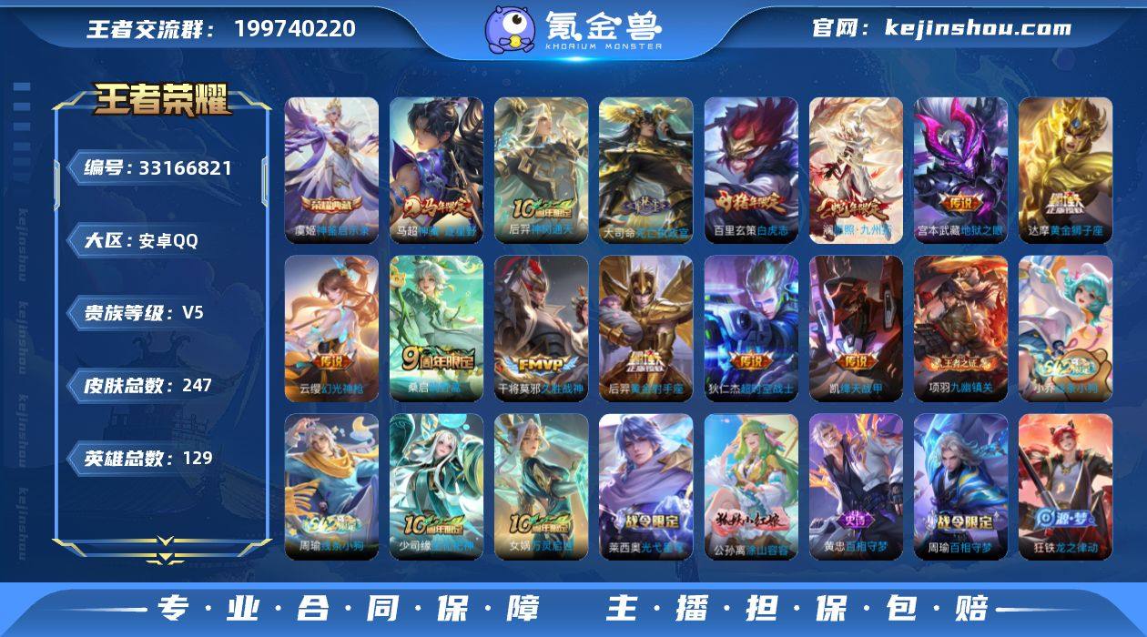 安卓Q-V5-最强王者段位-129英雄-247皮肤-1典藏皮肤-13传说-67史诗 【英雄全皮】:孙权全皮,大司命全皮,敖隐全皮,空空儿全皮 【荣耀典藏】:虞姬神鉴启示录 【传说皮肤】:马超神骥逐星野,后羿神树通天,大司命死亡执政官,澜愿照九州拓,云缨幻光神枪,桑启鸣野蒿,铠绛天战甲,干将莫邪久胜战神,达摩黄金狮子座,百里玄策白虎志,后羿黄金射手座,宫本武藏地狱之眼,狄仁杰超时空战士 【限定皮肤】:大乔绒语心约,姜子牙天穹之誓,狄仁杰阴阳师,赵云皇家上将,嬴政优雅恋人,元歌云间偶戏,马可波罗暗影游猎,狄仁杰魔术师,项羽海滩派对,孙悟空至尊宝,百里玄策白虎志,百里玄策原初追逐者,裴擒虎擒涛扼浪,云中君纤云弄巧,上官婉儿梁祝,嫦娥拒霜思,西施玲珑珍味,鲁班大师探海日志,桑启海盐诗旅,艾琳流音漫舞,阿古朵江河有灵,张良古海寻踪,蒙犽百解令,高渐离燃音魔法,妲己灵卜魔法,鬼谷子天穹祈灯,姬小满妄想食味,沈梦溪龙舞盛年,刘邦剑破天穹,程咬金群星魔术团,刘备异域游侠,周瑜熔金海岸 【年限皮肤】:百里玄策白虎志,澜愿照九州拓 【赛季限定】:桑启海盐诗旅,裴擒虎擒涛扼浪,鲁班大师探海日志,张良古海寻踪,鬼谷子天穹祈灯,刘邦剑破...
